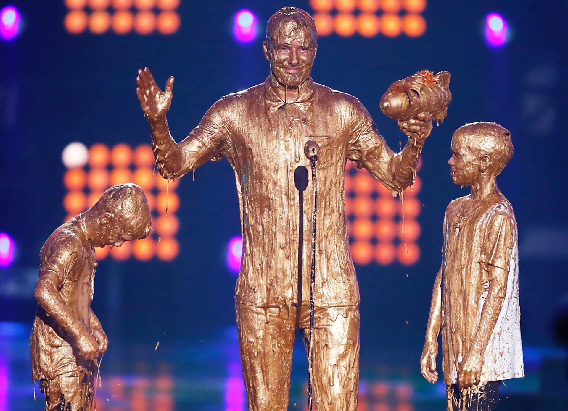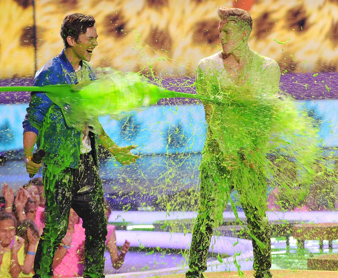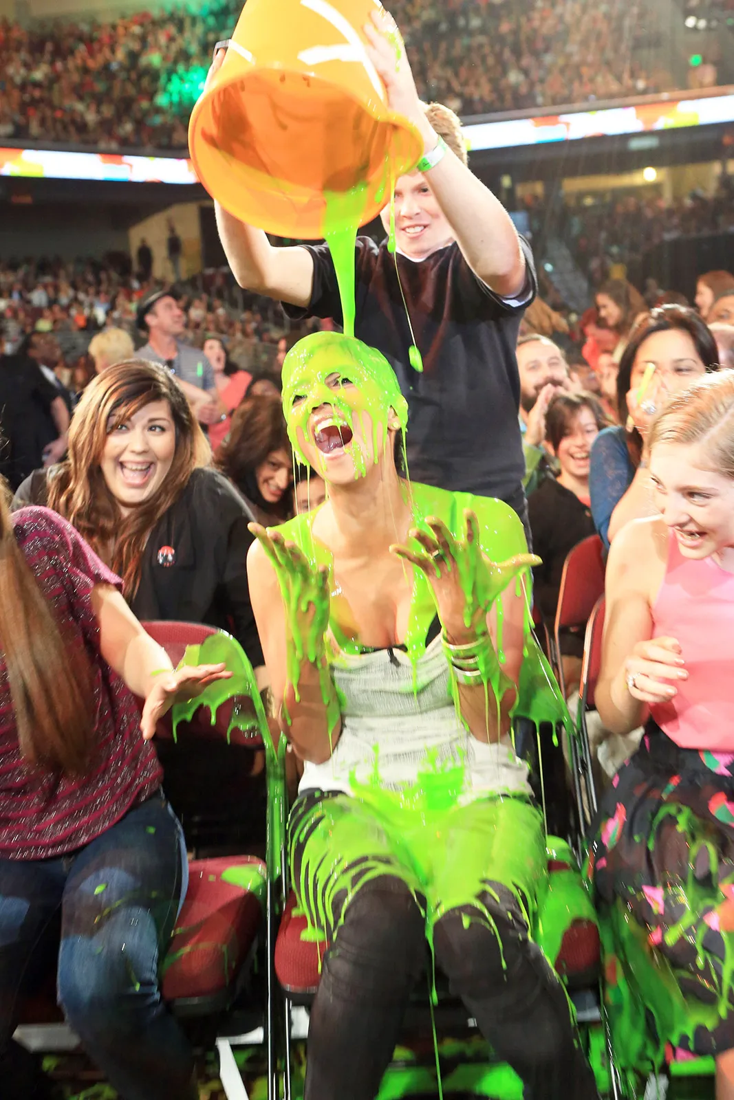 Fans have watched everyone from Chris Pratt and JoJo Siwa to Sandra Bullock and Orlando Bloom be sprayed with the gooey substance. Halle Berry, John Cena and even Harrison Ford have fallen victim to the iconic slime session.