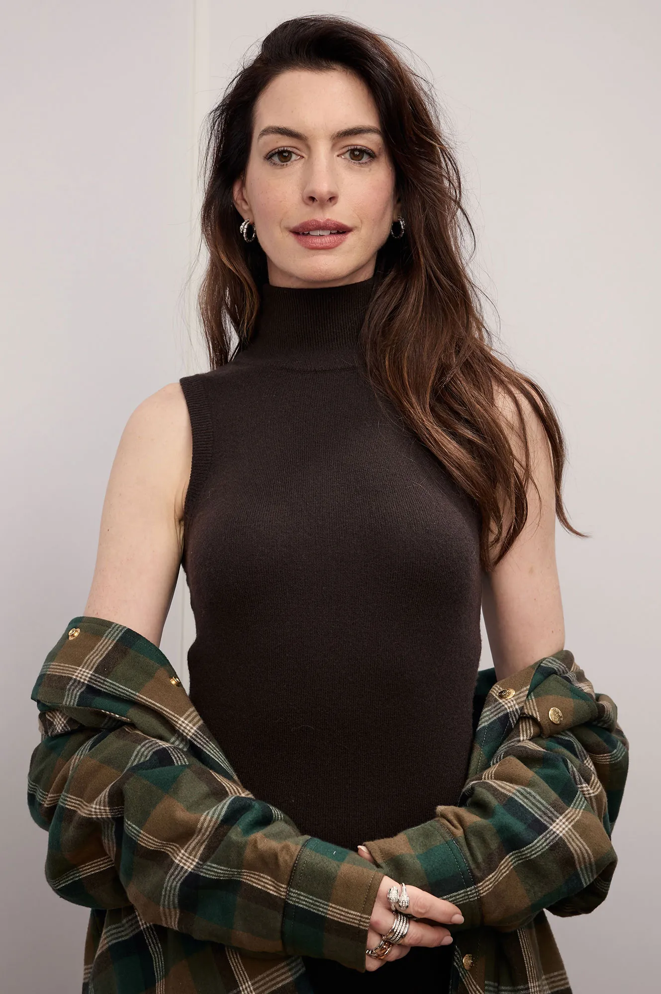 She rocked an oversized Celine plaid shirt over a brown, high-neck dress with leggings and boots on Saturday while promoting her role as Rebecca Saint John in Eileen.