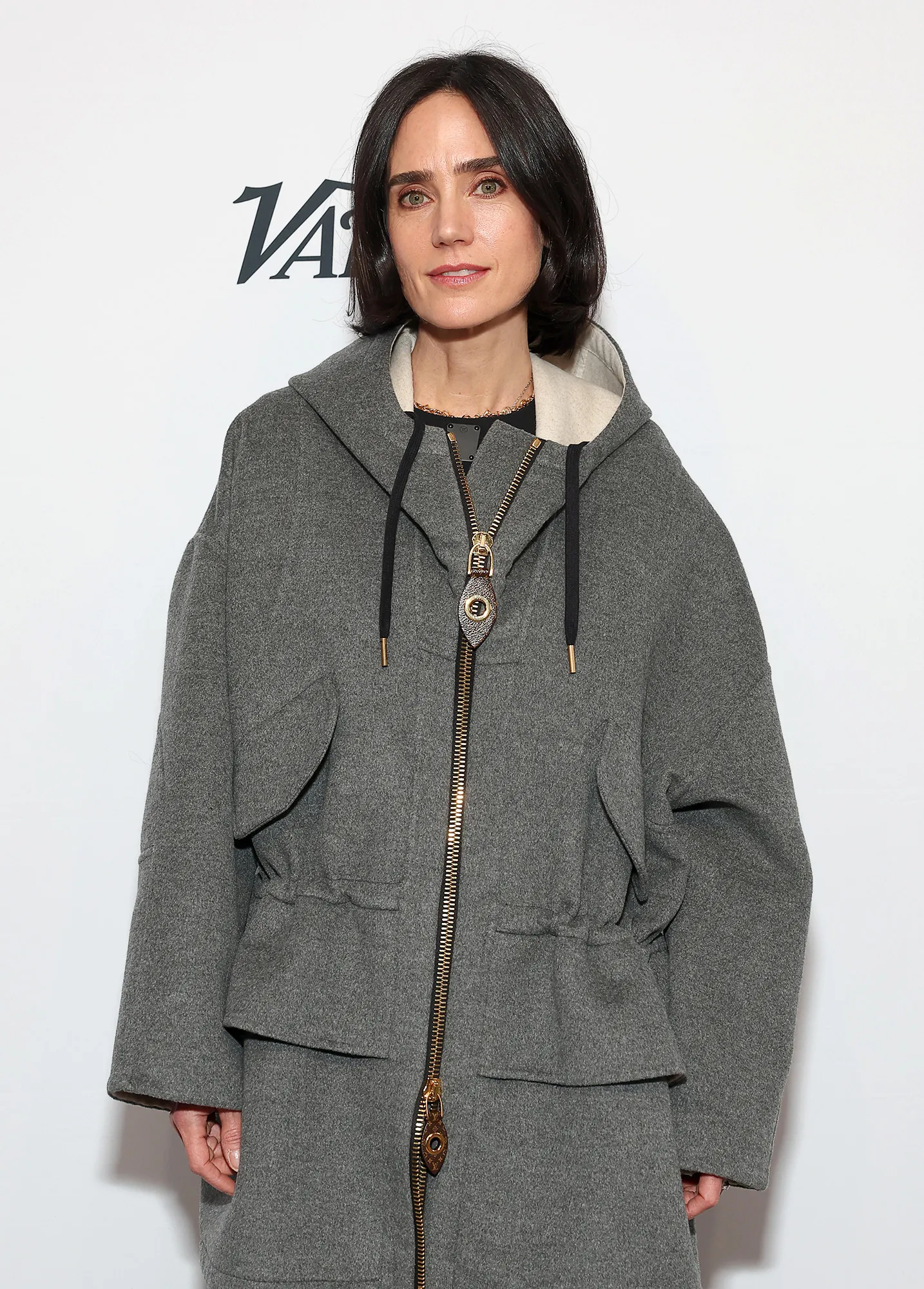 Hathaway, for her part, made fans do a double take on Saturday when she stepped out in a Versace puffer coat at the Eileen premiere. She wore a little black dress under the corseted jacket along with black tights and moto boots.