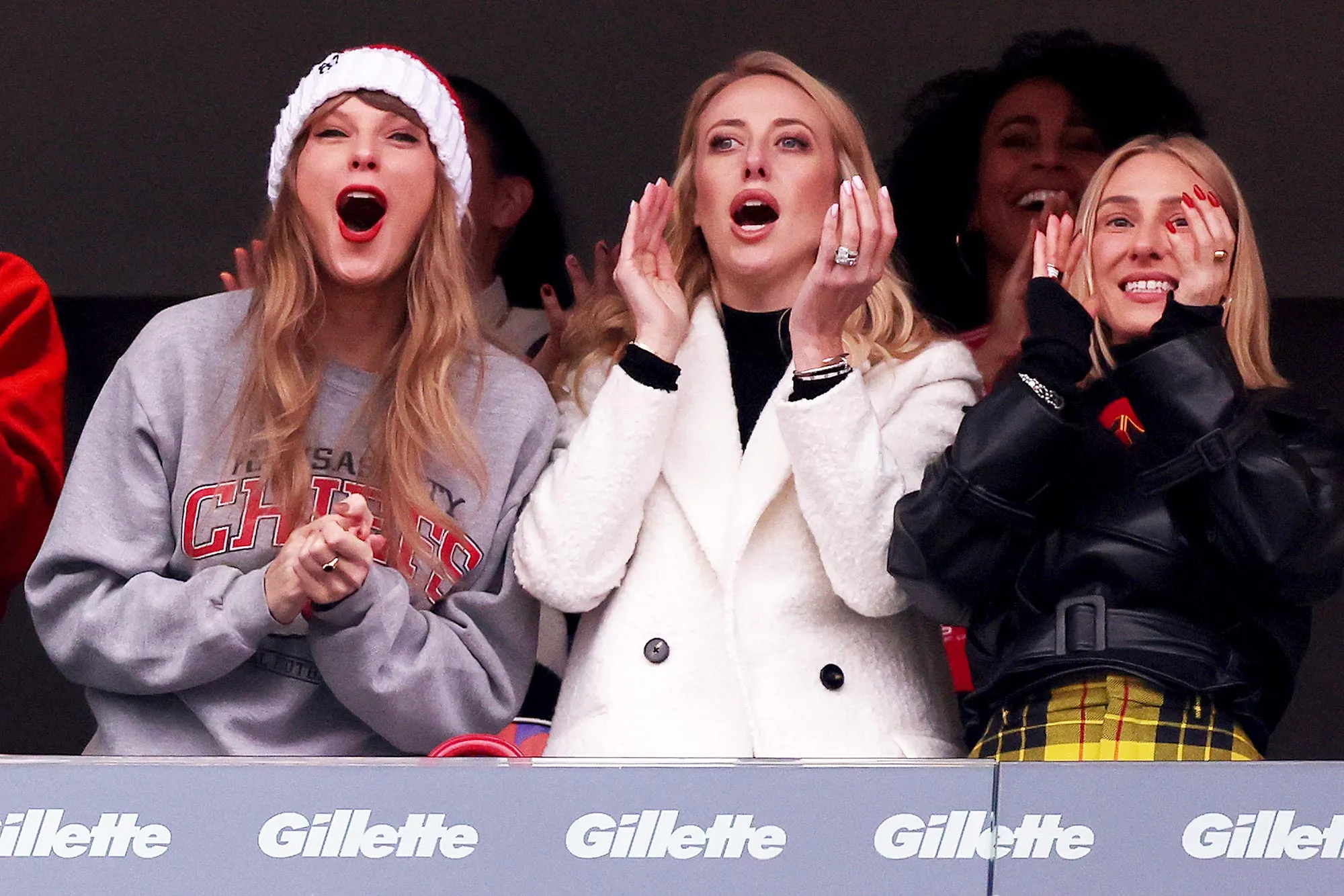 Swift sat in a box with Brittany, the wife of Chiefs starting quarterback Patrick Mahomes, and her dad, Scott. The Grammy winner also invited pals Alana Haim, Melanie Nyema and Ashley Avignone to join their Chiefs cheering section in different team gear.