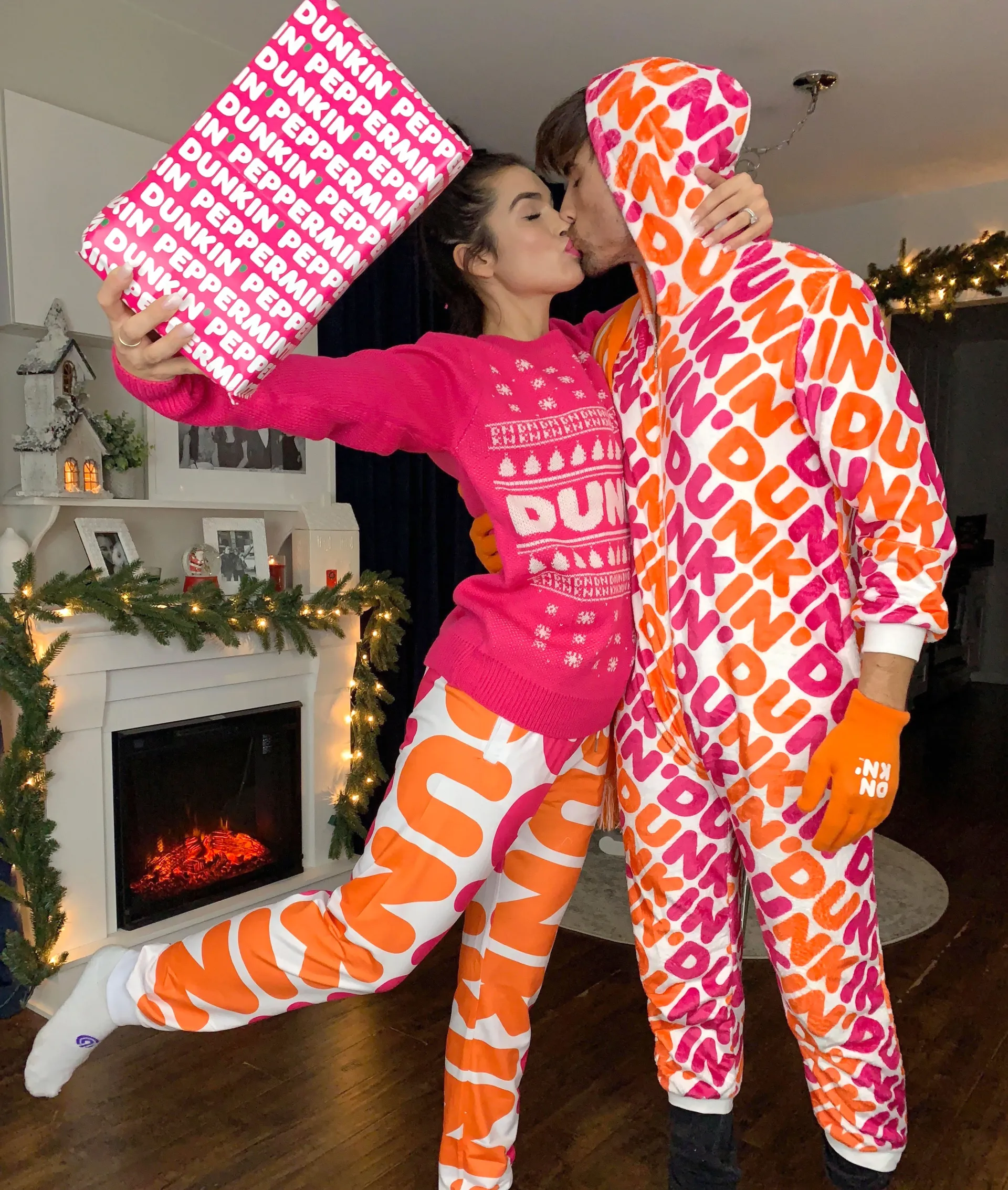 Haibon, 30, took a slightly simpler approach and chose to wear the chain’s new onesie, which is covered in that familiar pink and orange Dunkin’ logo. The Rhode Island native also stayed cozy with some help from a pair of orange gloves, which are sold as part of a winter set that includes a matching scarf.