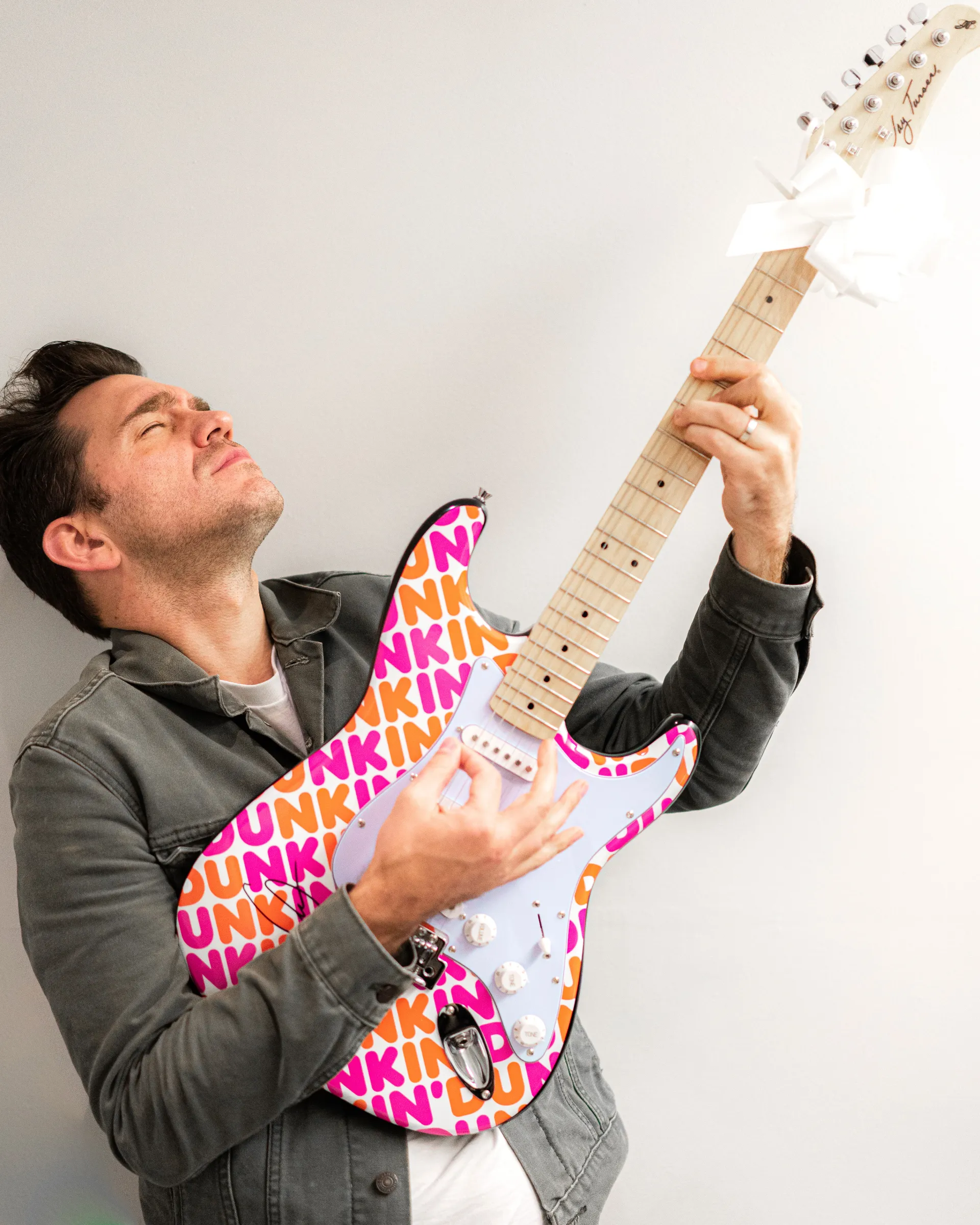 While the newlywed couple marked the debut of Dunkin’s holiday array with plenty of apparel, Grammer celebrated with something a bit closer to his heart — a guitar! The branded instrument, which is also part of the eatery’s festive collection, is decked out with that familiar Dunkin’ signage. By the looks of the photos, the musician is really digging his new toy.