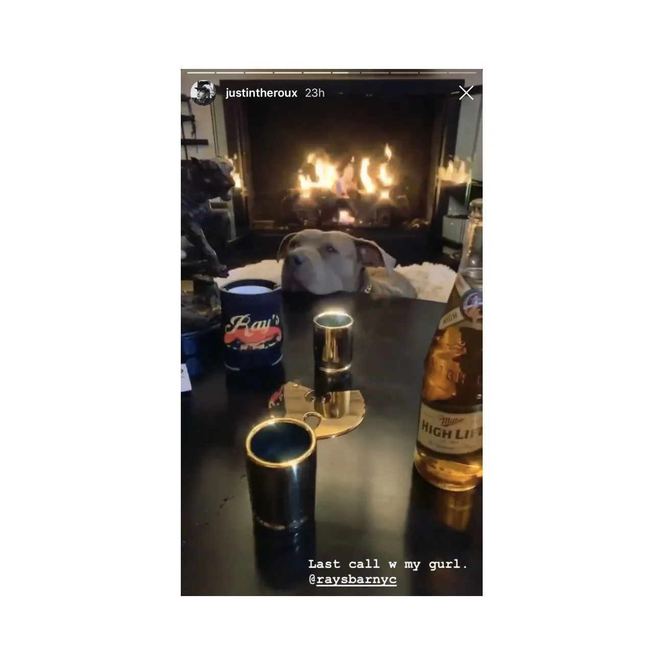 On Saturday, April 18, Theroux took to his Instagram Stories to share his version of a disco night in with his beloved pet. The evening included burgers from his own bar, Ray’s, on the Lower East Side, music, a makeshift disco ball and even dog-friendly “shots.”