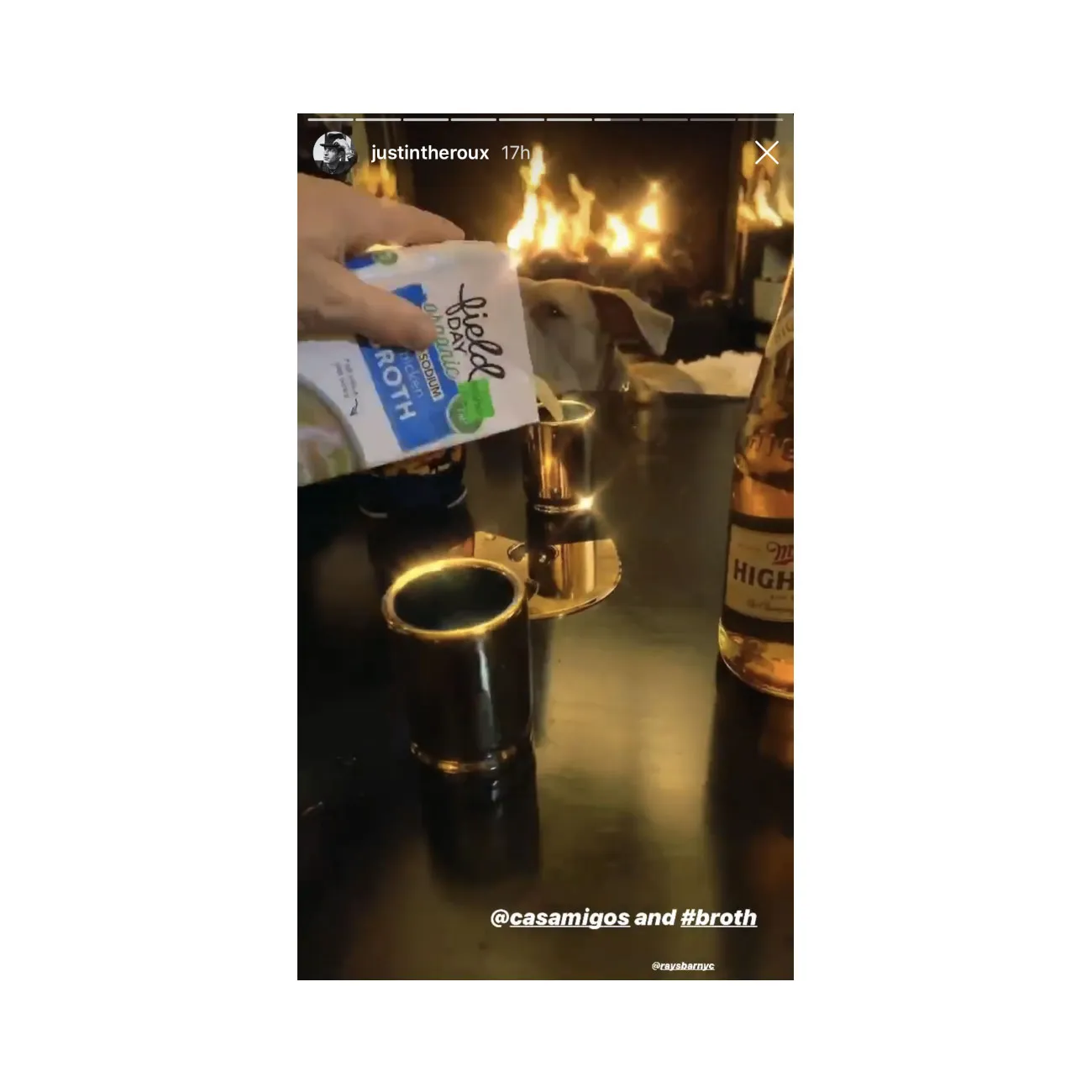 After dinner, the pair enjoyed some shots. While Theroux poured himself some Casamigos tequila, he gave Kuma some animal-approved chicken broth in her shot glass instead.