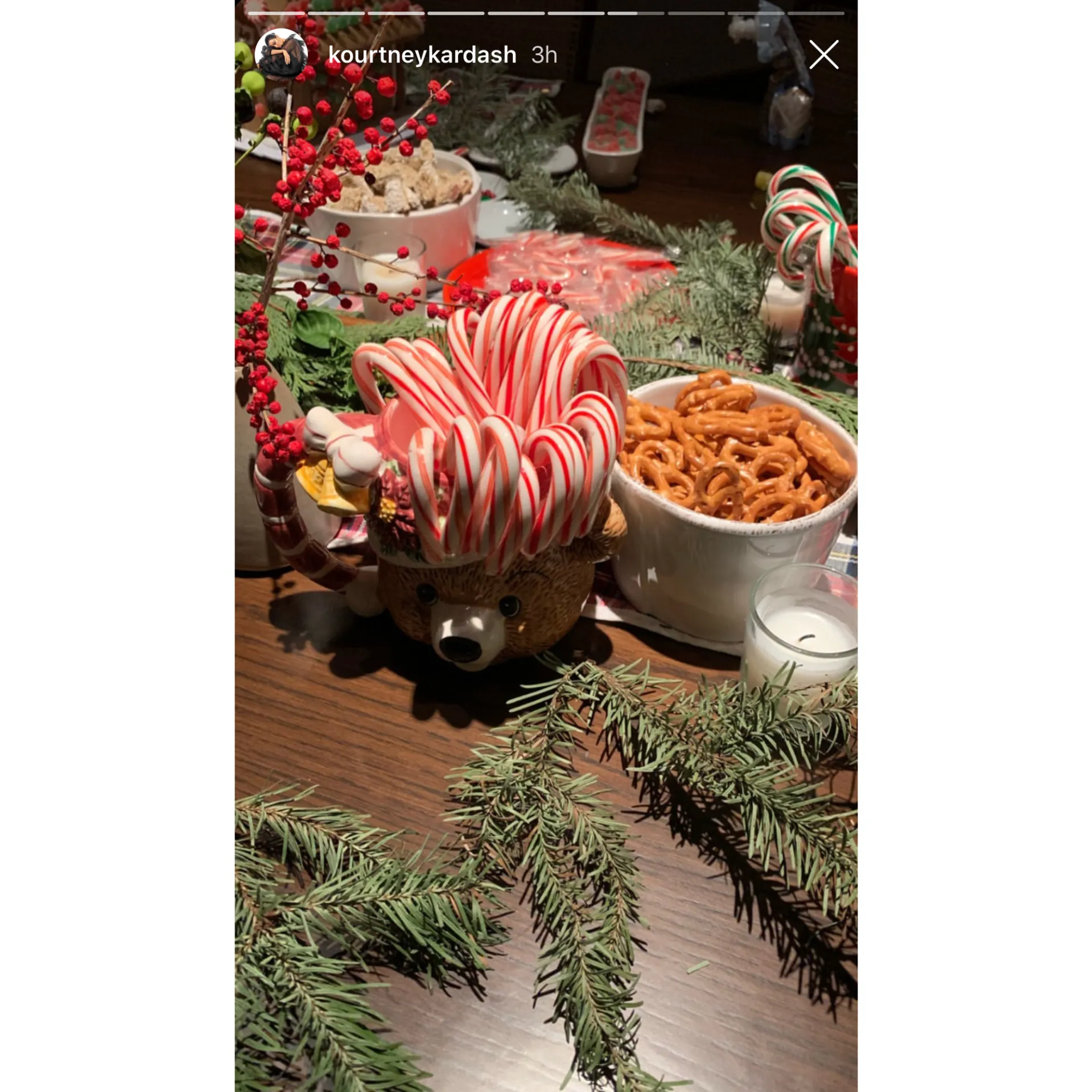 Aside from a drool-worthy array of foods to decorate with, Kardashian also made sure her table was in the holiday spirit too. It was adorned with a red and green plaid tablecloth and matching placemats, pine sprigs, various little plants and mini scented candles.