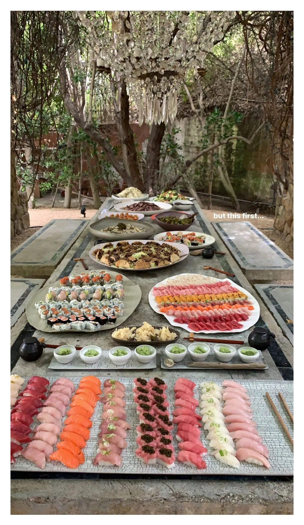 However, even the healthy reality star knew that the fruit wasn’t the main attraction. In a separate photo on her Instagram Stories, she shared a look at a sushi spread that would make anyone a little jealous. “But this first …,” she wrote over the impressive picture.