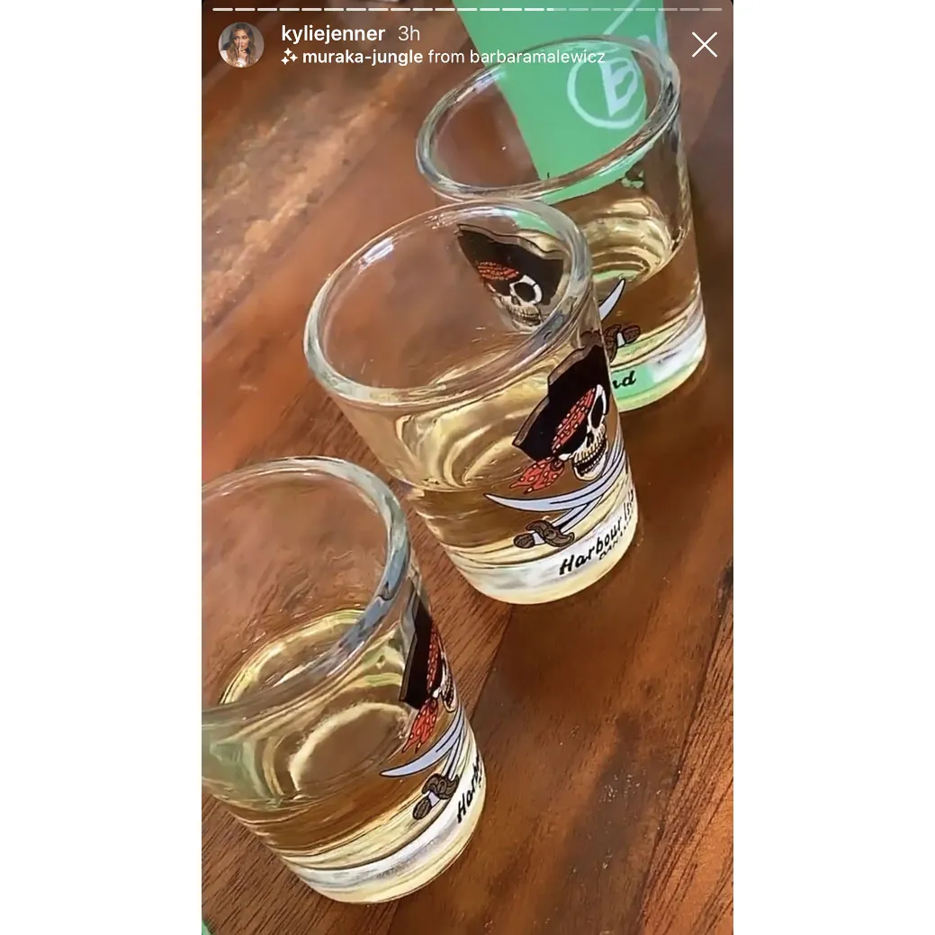 Later, the Kylie Cosmetics founder let loose a bit and posted a photo of three shot glasses lined up in a row. The drinking vessels each had a pirate skull with two swords on them as well as the words “Harbour Island,” which is likely where Jenner and her crew are vacationing. The clandestine and picturesque locale lies just northwest of Eleuthera Island in the Bahamas.