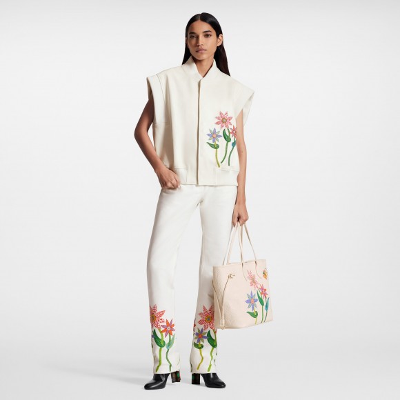 The LVxYK Neverfull MM gets a feminine crafted touch with the “Flower” theme of the Louis Vuitton x Yayoi Kusama collectsion. Flowers were a major part of the artist’s childhood in Japan, where her parents ran a plant nursery, and later became a prominent theme in her work. For this user-friendly bag, three colorful blossoms are depicted in leather marquetry on quartz white Monogram Empreinte cowhide. An ode to art and craftsmanship.