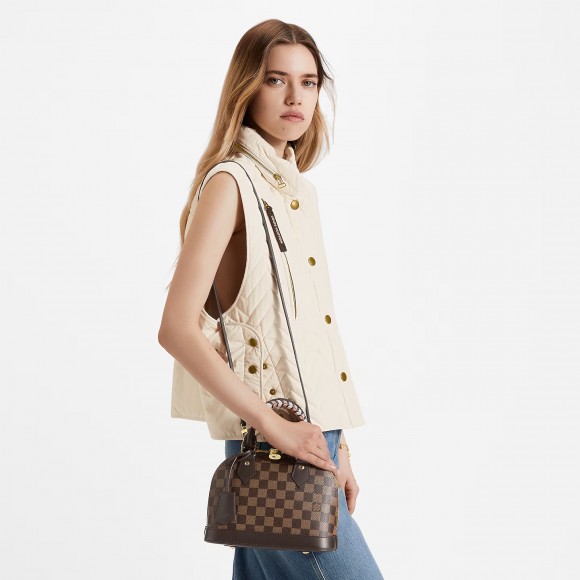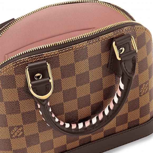 For the new season this Alma BB handbag sports a fresh take on the Maison’s signature Damier Ebene canvas. The color play on the bag’s braided handles add an irresistible crafted touch to this feminine piece, which can be styled in a host of ways, from hand carry to cross-body and more.