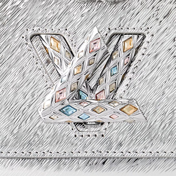 Made from mini Epi leather with a mirror effect, the Twist PM handbag has a silver LV Twist lock covered with Swarovski strass with a quilted aspect, reminiscent of the quilting found inside Louis Vuitton trunks. The chain, braided with leather, enables shoulder and cross-body wear. The bag is roomier than expected, thanks to its “wave” base.