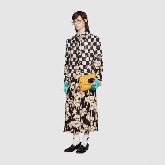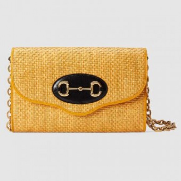 A member of the House’s Beloved family, the world of Gucci Horsebit 1955 is enriched by a versatile hybrid style. Crafted with a detachable chain shoulder strap, the accessory seamlessly transforms from a shoulder bag to a clutch. The accessory’s gold-toned Horsebit hardware is complemented by yellow toned fabric with a straw effect.