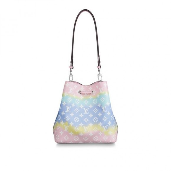 The NéoNoé bucket bag comes in Tie-Dye Monogram canvas for the Louis Vuitton Escale Collection. Present across Louis Vuitton handbags, shoes and ready-to-wear this season, this unexpected motif is inspired by the Japanese Shibori technique of knotting fabric before dyeing it. A lightweight bag, with a removable strap for a shoulder or cross-body carry.