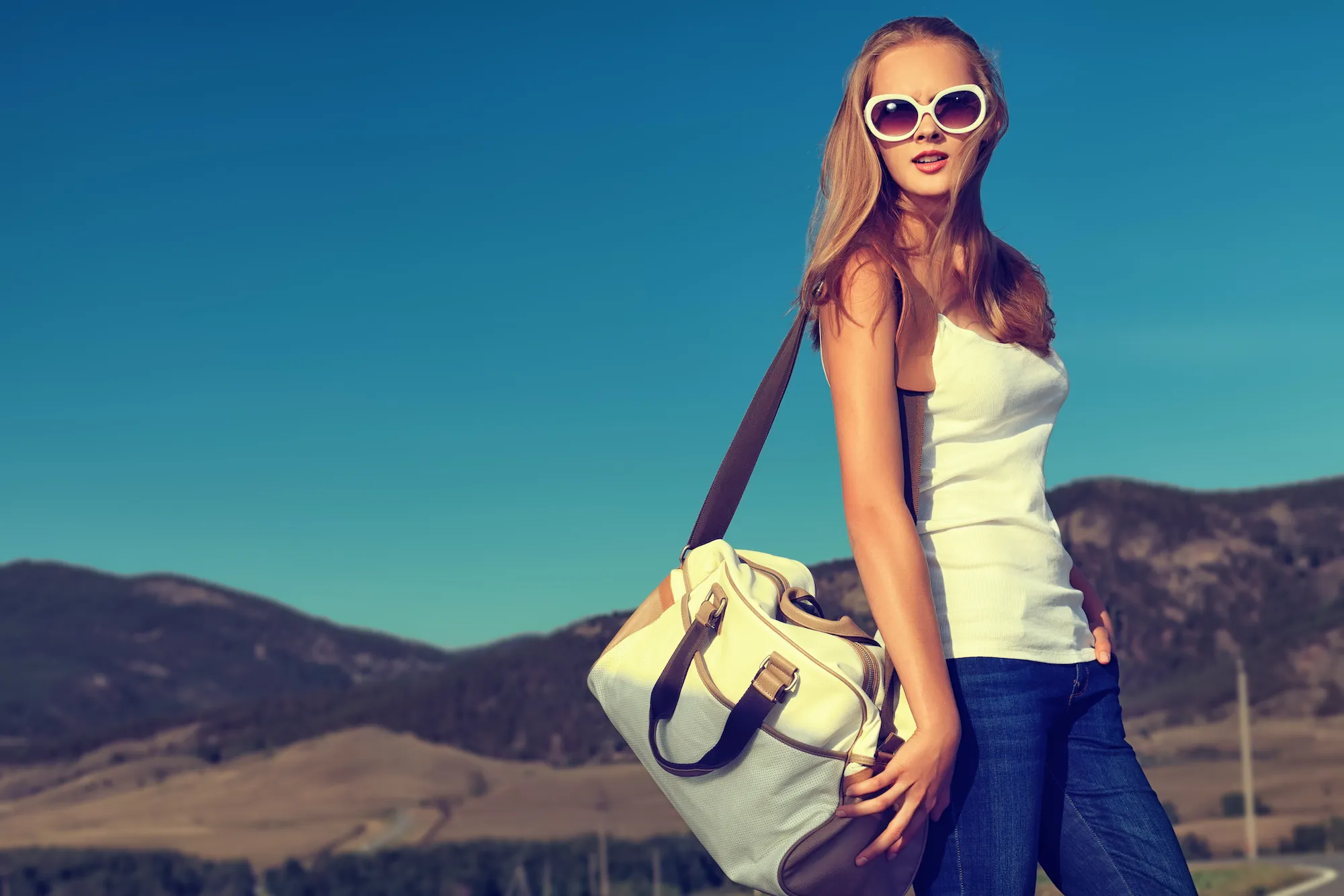 The off-white canvas and brown faux-leather trim on this weekender bag look adorable together — we adore its classically chic travel aestheticf!