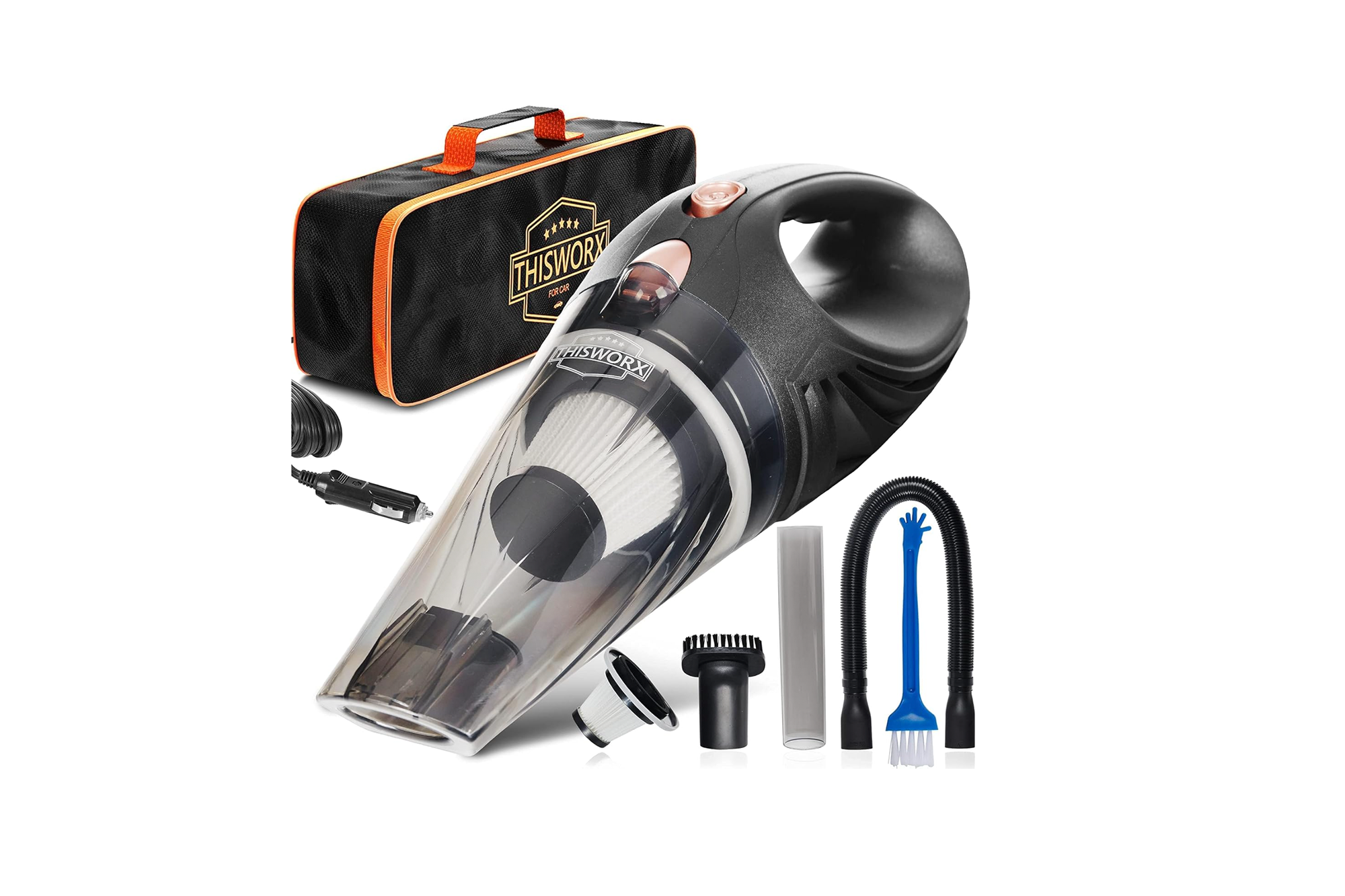 The ThisWorx Car Vacuum Cleaner is a practical and powerful piece of equipment. It is a lightweight, compact, handheld vacuum equipped with a HEPA filter — meaning it can effortlessly handle all the ash, dust or drive-through spills that come along. This vacuum has a strong cyclonic force and the suction power of a 106w motor, along with a 16-foot cord for a strong and long-reaching option.