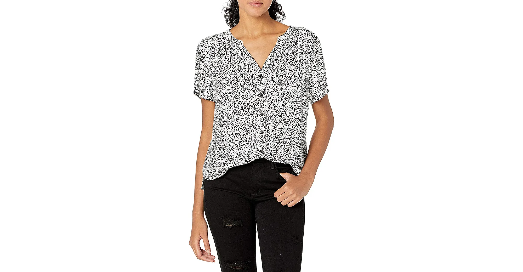 This top currently holds a spot on Amazon’s bestselling women’s blouses list, and it’s even earned the coveted title of Amazon’s Choice. It’s made of very lightweight and flowy viscose fabric and has dainty buttons running up the front to a V-neckline. It has a rounded shirt-tail hem with notches at the sides and it has a relaxed, comfy fit!