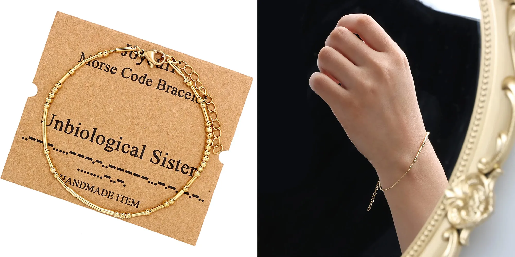 This gold bracelet (also available in silver!) doesn’t have any lettering — or, at least it doesn’t seem to at first. It actually uses Morse code beads to keep things subtle, spelling out “unbiological sister.” How sweet is that?