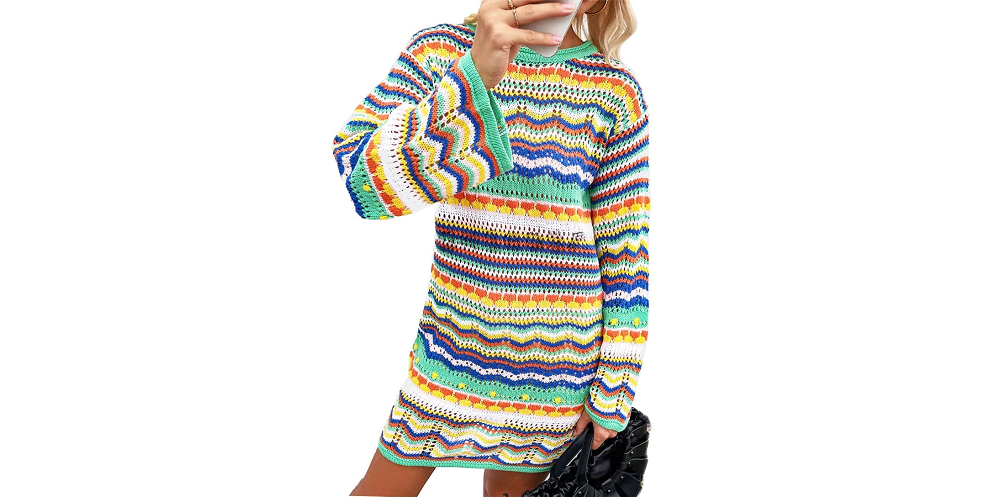 Get the Fu jian juan Rainbow Striped Long-Sleeve Loose Crochet Mini Sweater Dress for just $37 at Amazon! Please note, prices are accurate at the date of publication, April 4, 2022, but are subject to change.
