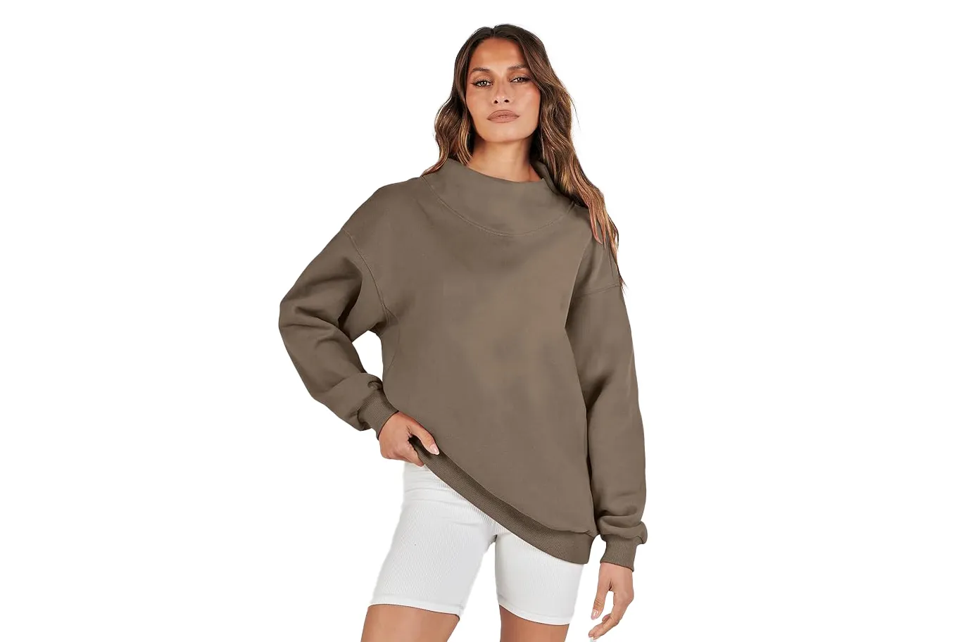 Allow me to introduce you to Anrabess’ mock neck long-sleeve turtleneck — a sweatshirt that has the outward appearance of a cute sweater, but the interior feel of your favorite cozy sweatshirt. What gives this sweatshirt its chic aesthetic is primarily the mock neck, dropped shoulders and oversized fit. The former provides the appearance of a turtleneck, but with a wider width and opening which dramatically draws attention to the face. Swoon!