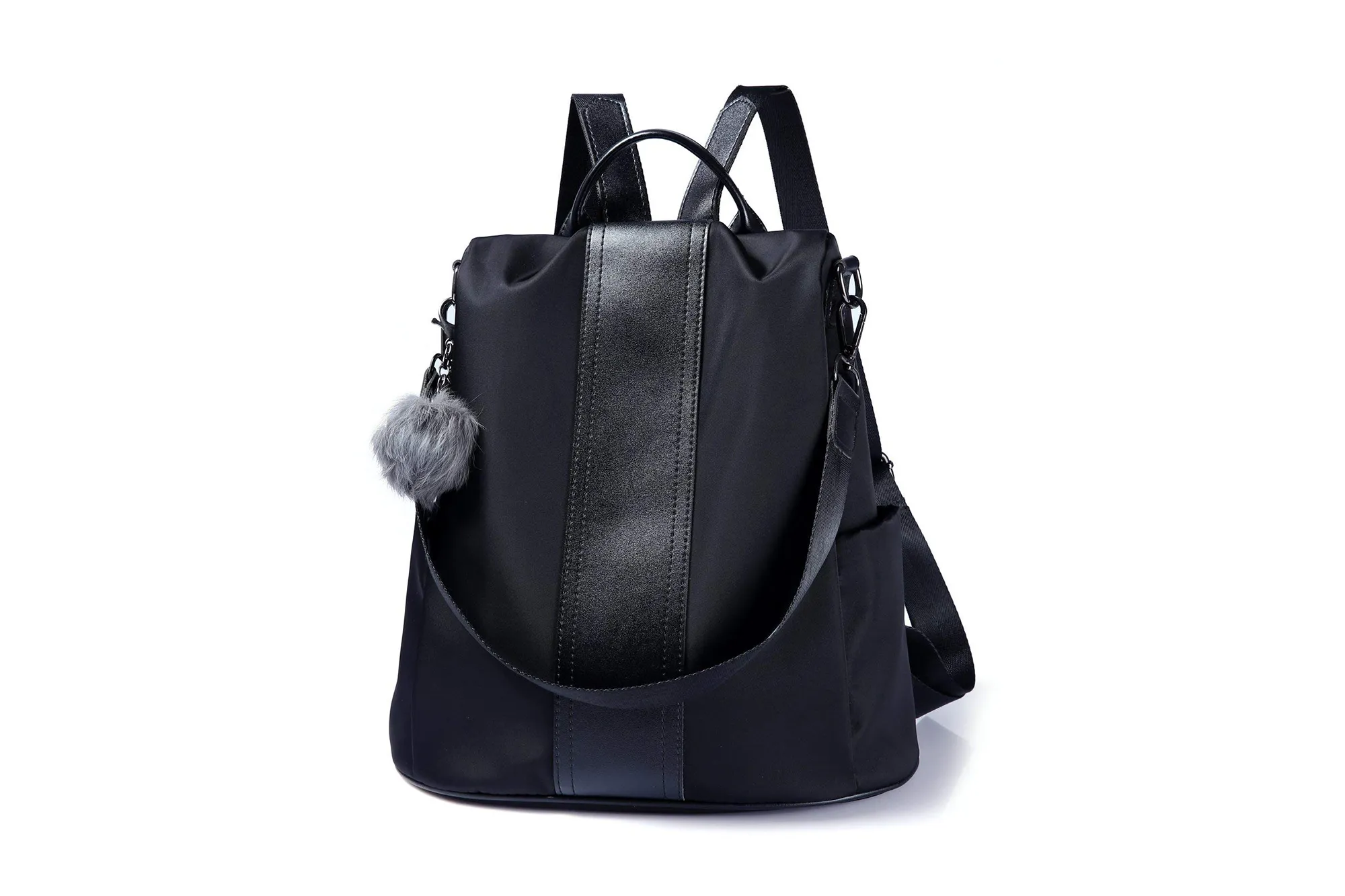 This bag is made of a water-resistant nylon and features a stylish PU leather stripe down the center. Even more stylish is the cute pom pom keychain hanging off the side! This bag has two adjustable long shoulder straps, as a typical backpack would, but it doesn’t stop there. It also has a detachable single-shoulder strap for crossbody wear and a top handle for carrying in our hand!