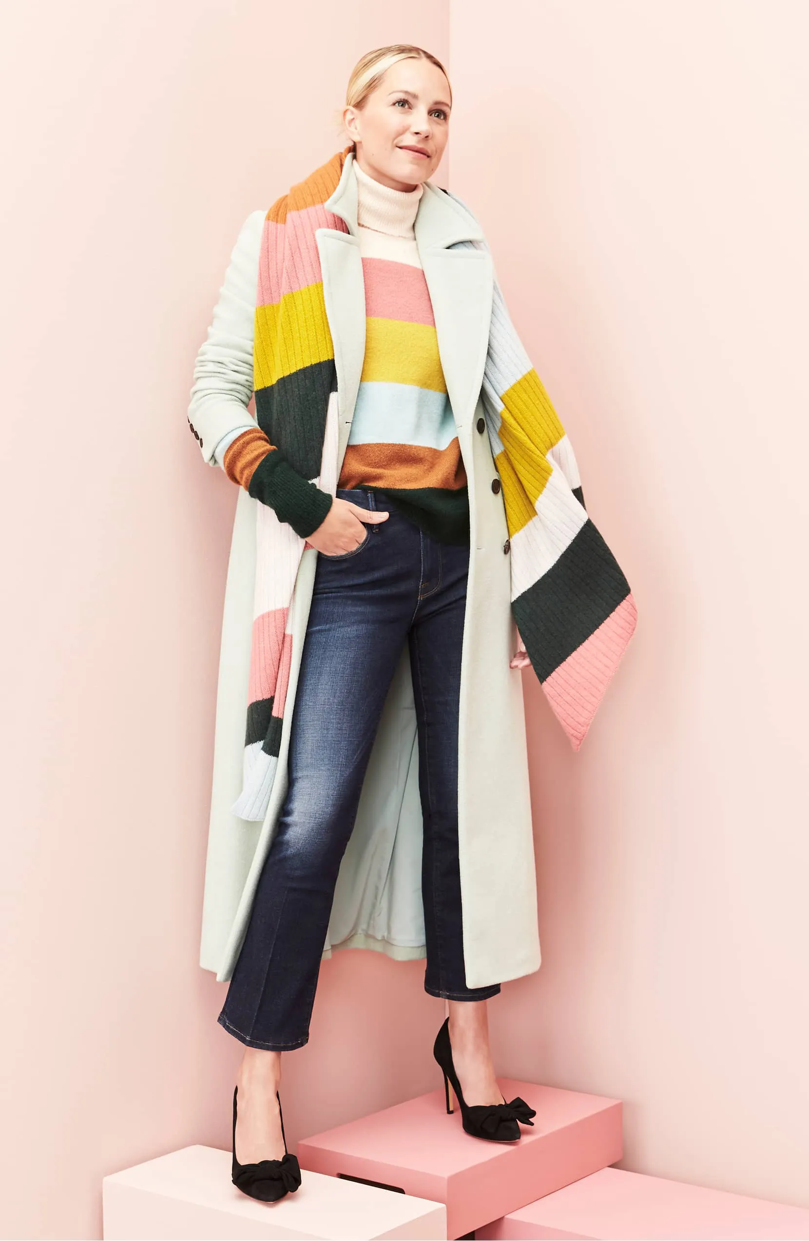 Since cashmere wraps are also an Us reader favorite, we have kept our eyes open for new designs to drop at our favorite places to shop. We are currently obsessing over a colorful stripe wrap that we cannot wait to wear all season long.
