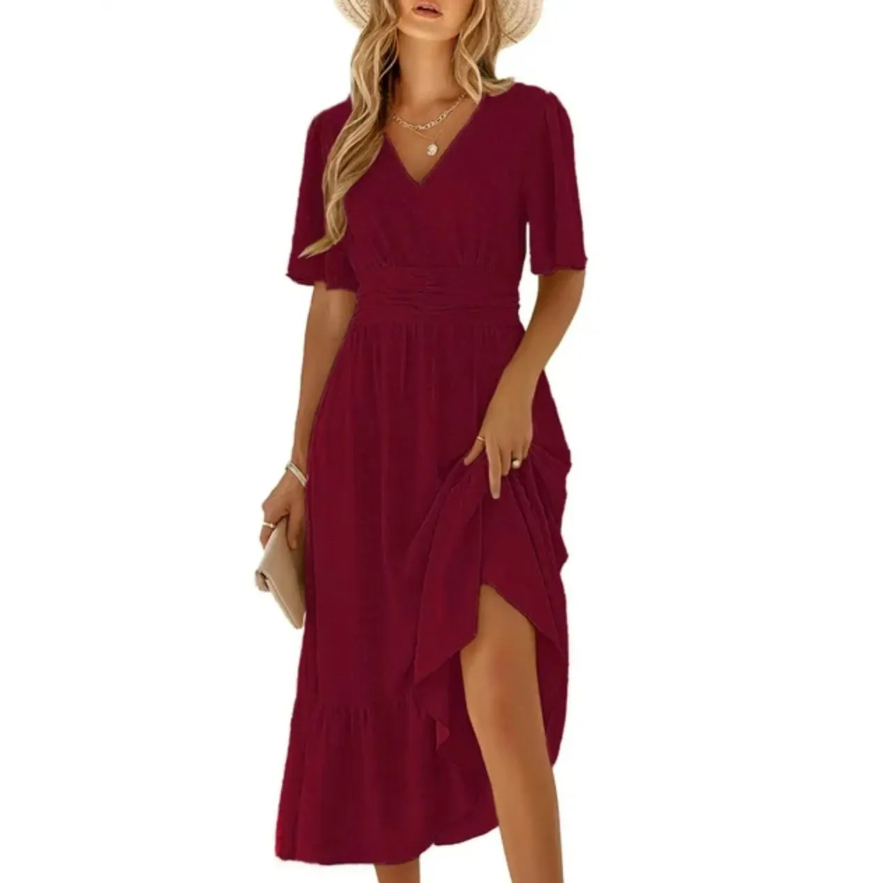 Polyester fabric is what keeps this dress extra stretchy, making it equally suitable for day-to-day wear and nice events alike. For casual, everyday occasions, the sky’s the limit with styling. You can pair the dress with sandals, sneakers, a jean jacket, a leather jacket or anything else you have in your closet. For dressy occasions like weddings, family photos, formal dinners and other upscale events, try wearing it with layered necklaces, a watch, heels and a sparkly clutch. You’ll be turning heads, so if you’re rocking the frock to a wedding, be careful not to steal the show!