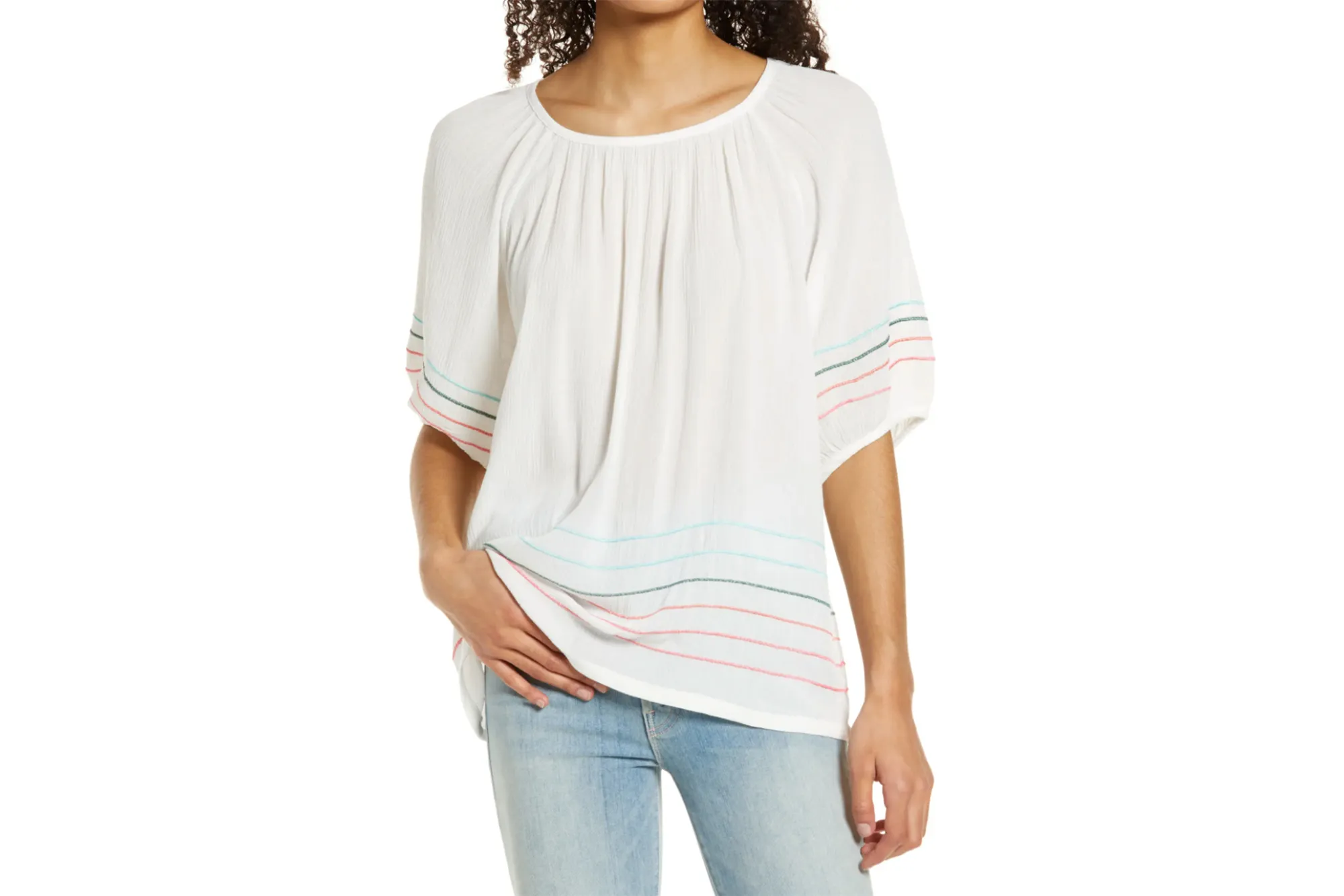 The blouse is straightforward in its design, which is what makes it absolutely timeless. It has a loose silhouette with wide sleeves that just graze the elbows, plus a simple scoop neckline. The tiny detail that makes the top special is the embroidery along the hems and sleeves. Both of these points offer the same striped stitching rendered in different colors.