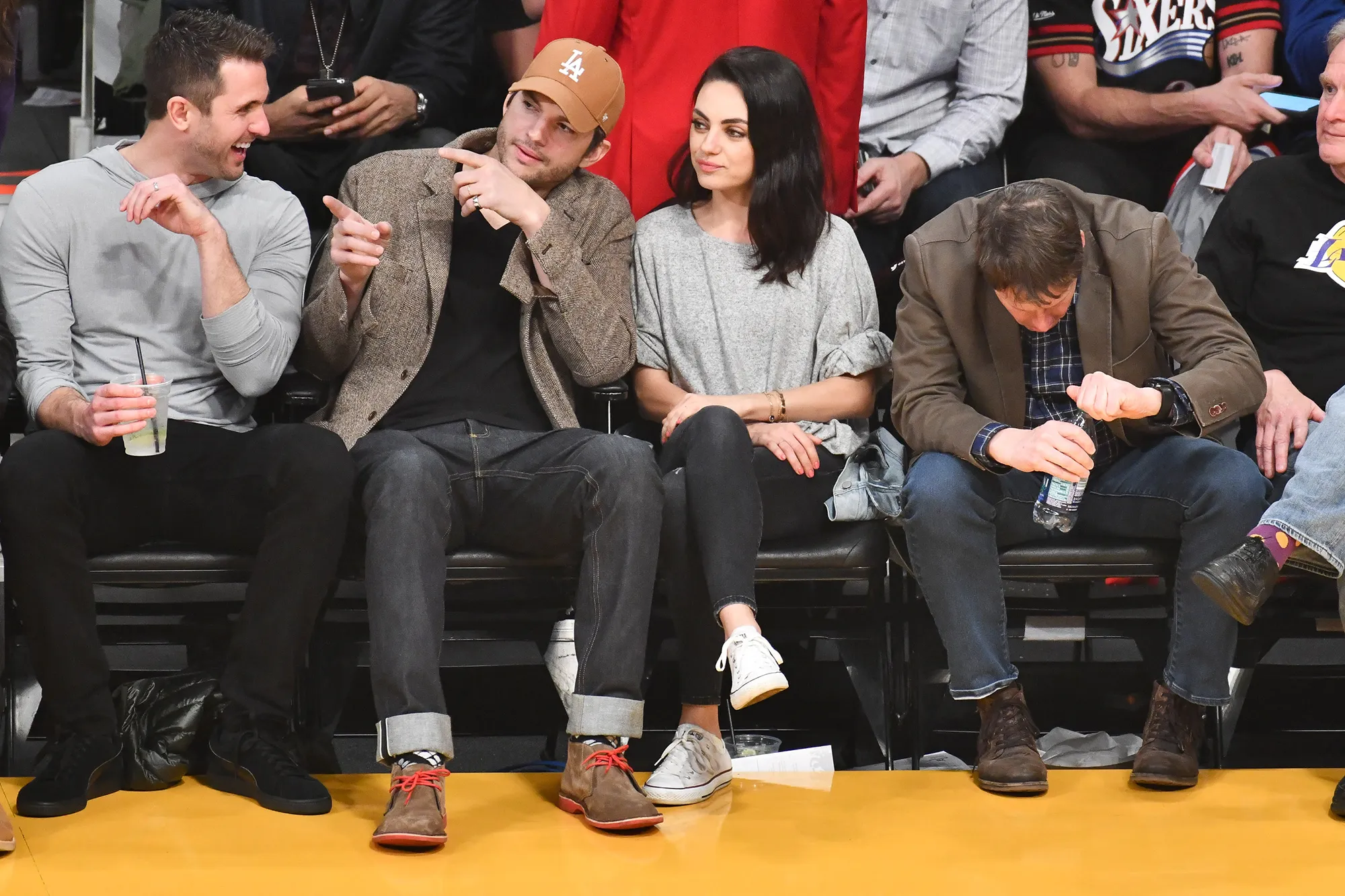 It seems like model Kaia Gerber is almost always wearing Converse. Recently, she wore a red pair at a Los Angeles Lakers game and her outfit had us feeling inspired. She wore cropped, straight-cut blue jeans and an oversized black V-neck sweater which hung elegantly off one shoulder. A la Bieber, Gerber also wore gold hoops. She parted her straight brown hair down the middle and sported a smile while sitting next to Cameron Azoff, who was certainly dressed for the occasion!