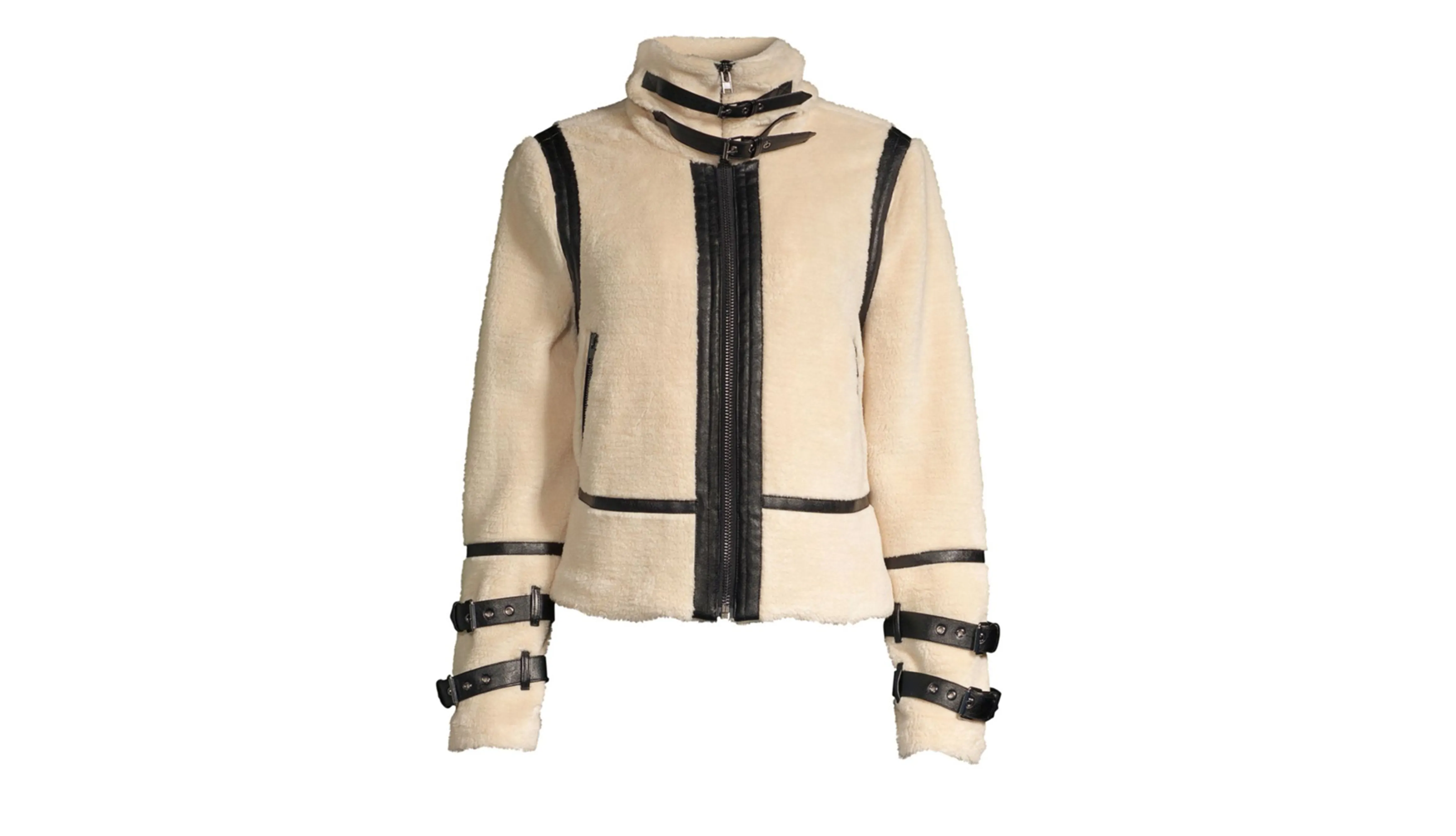 Let’s not forget that this faux-shearling moto jacket is available in another sensational shade, too! In terms of a more classic style, surely there is nothing more traditional than an off-white shearling. This toned-down, creamy-colored moto is simply beyond stunning. Designed with an off-white almost beige-hue as its base, this moto jacket brilliantly features black buckles alongside its edges. The contrast between the two is just divine. It goes without saying how much we love the spin on the traditional and sometimes boring black and white color scheme. In fact, we’d go ahead and call it our new classic as there’s nothing we want to wear more!