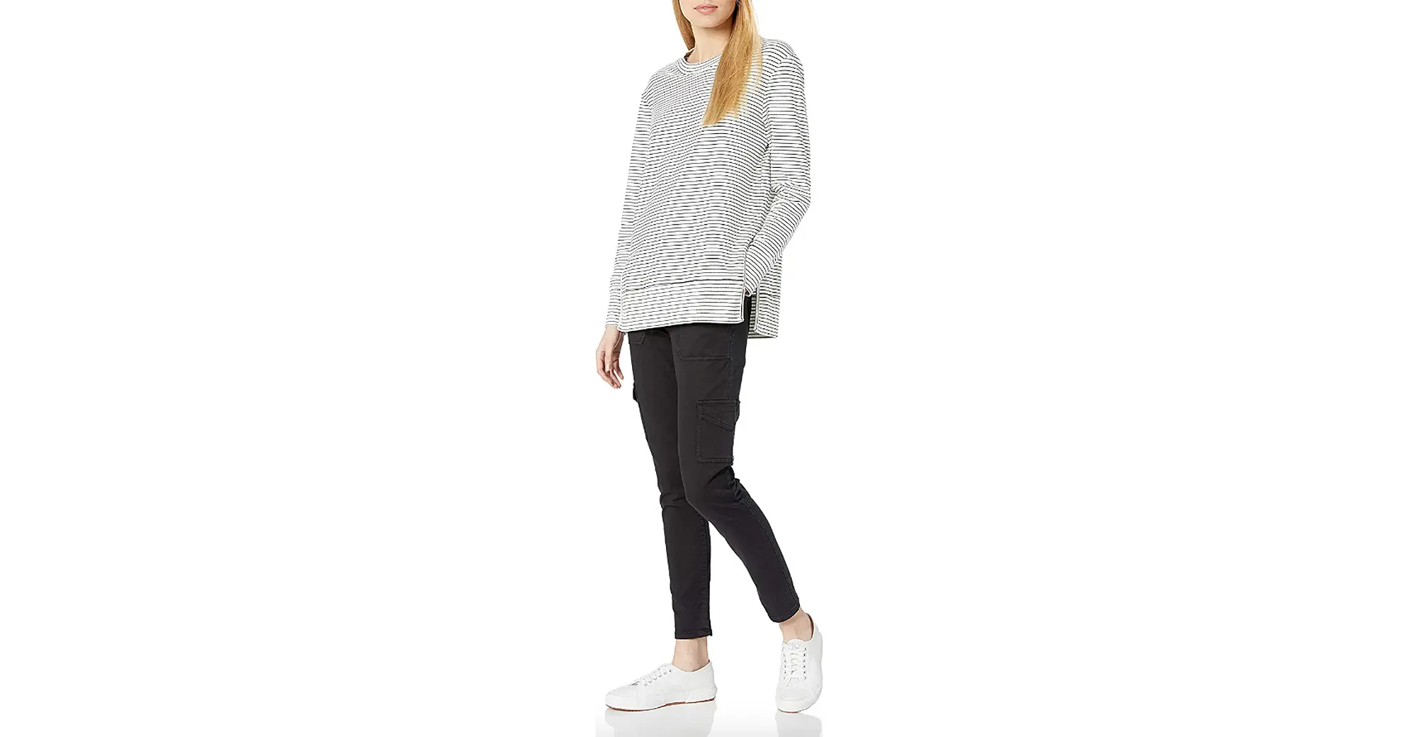 This Amazon-exclusive sweatshirt comes in nearly 30 colors and patterns. We were very drawn to this version with the skinny horizontal stripes, especially loving how they curve around the neckline. You’ll also find solid shades, tie-dye, marble print and more if you want to grab something else.