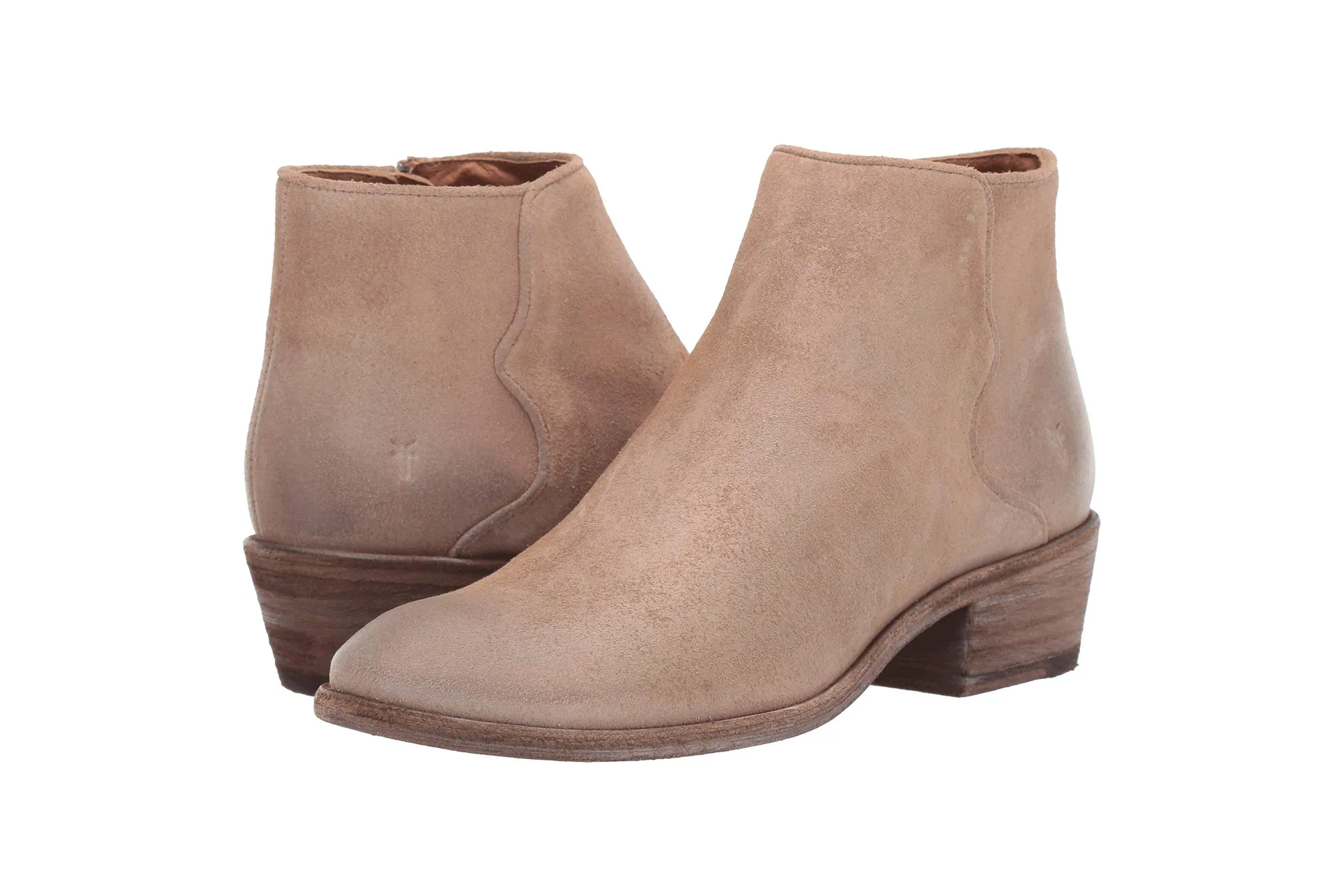 This boot has either a sleek leather or soft suede upper, depending on which version of the shoe you choose. It’s an ankle bootie with an almond toe, featuring a burnished look at both the toe and the heel for a vintage flair. At the side we’ll find an embossed logo and, on the inside, we’ll find a zip close for an easy on and off. Most notably, the upper features a Western-inspired piping accent down the side, making these boots stand out even more!