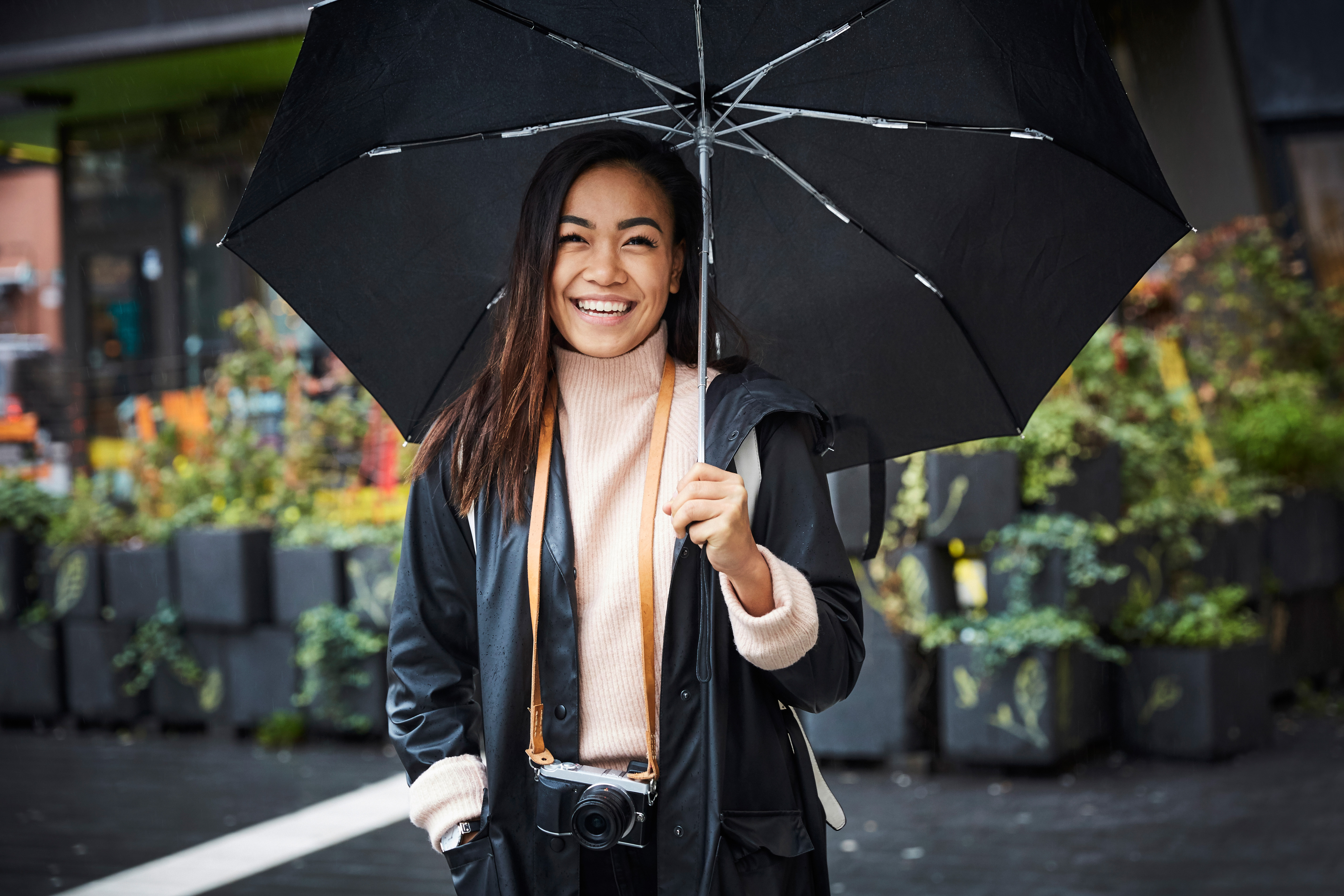 Oh, rain. We need it, but more often than not, we’d do anything to avoid it. Unfortunately, rain doesn’t always wait patiently for a lazy Sunday to make an appearance, and we’re forced to throw on our Hunter boots and face it. That’s why we have umbrellas to keep us dry! Too bad those umbrellas often have the opposite effect and end up soaking us and our outfits.