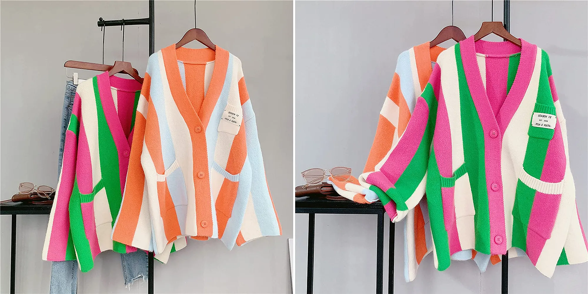 Don’t forget about the patch pocket on the chest, featuring a sewn-on tag for a high-fashion look, or the patch pockets at the hips, featuring contrasting colors for the opening trims. Speaking of colors, this cardigan has a wide, tri-color stripe design all over. You have two choices: creamy white, baby blue and melon orange or creamy white, hot pink and grassy green. Both are going to stand out in a crowd!