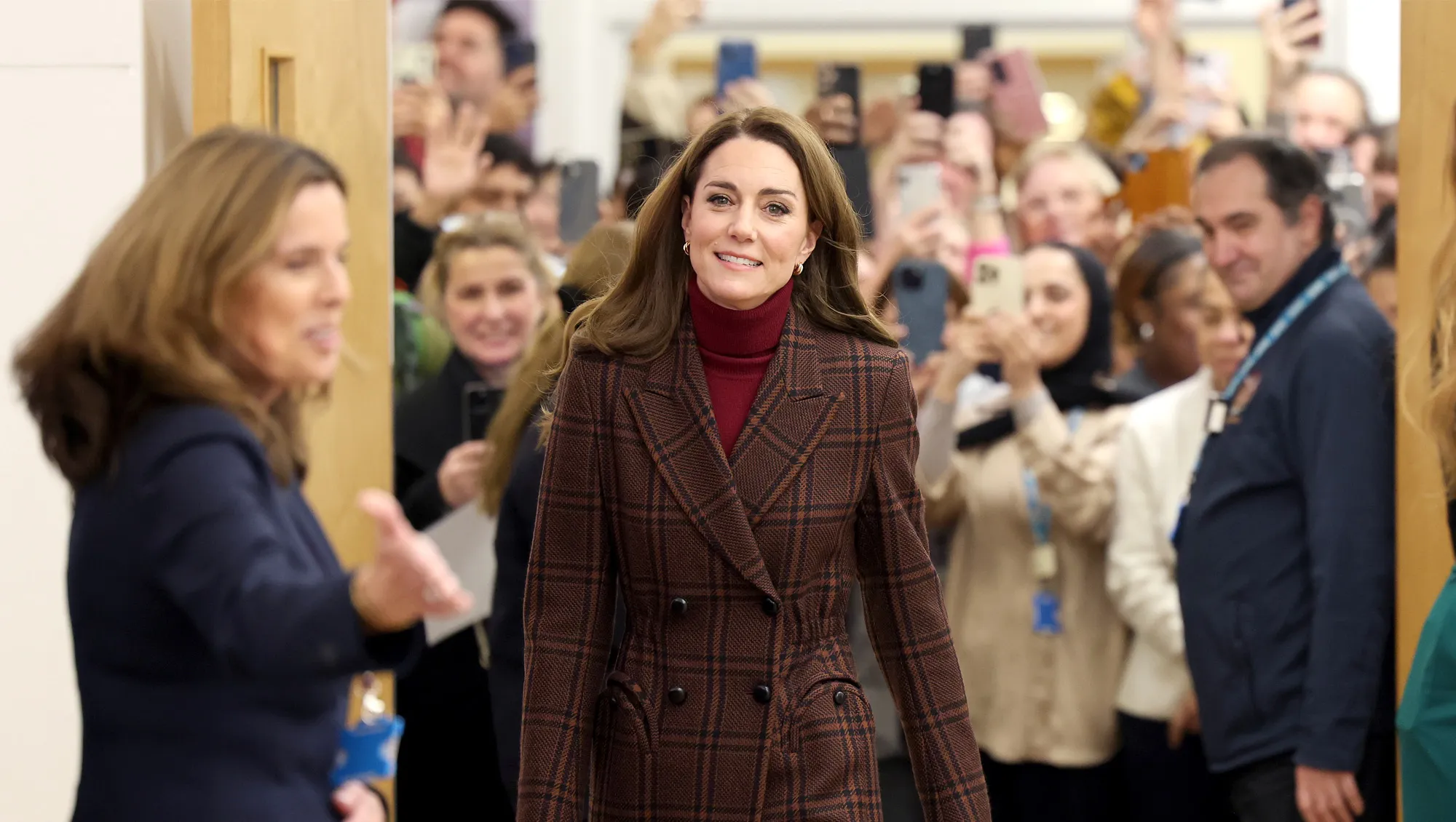 Middleton wore the look while attending a visit at The Royal Marsden Hospital on January 14, 2025. To be exact, she wore a burgundy turtleneck sweater — a color that’s totally trending for the new year. In classic Middleton fashion, she wore an ultra polished look, pairing the turtleneck with a matching slip skirt, a brown plaid trench coat and some brown pumps.