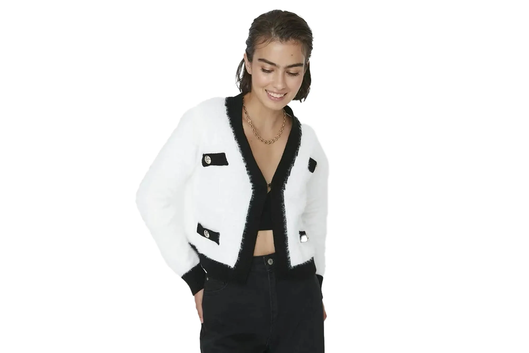 Simply put, the Trendyol Knitwear Cardigan is a luxurious find for less. It features a plush fuzzy fabric that’s buttery-soft, as well as a classy contrast of white and black fabric with subtle accents courtesy of gold button details.