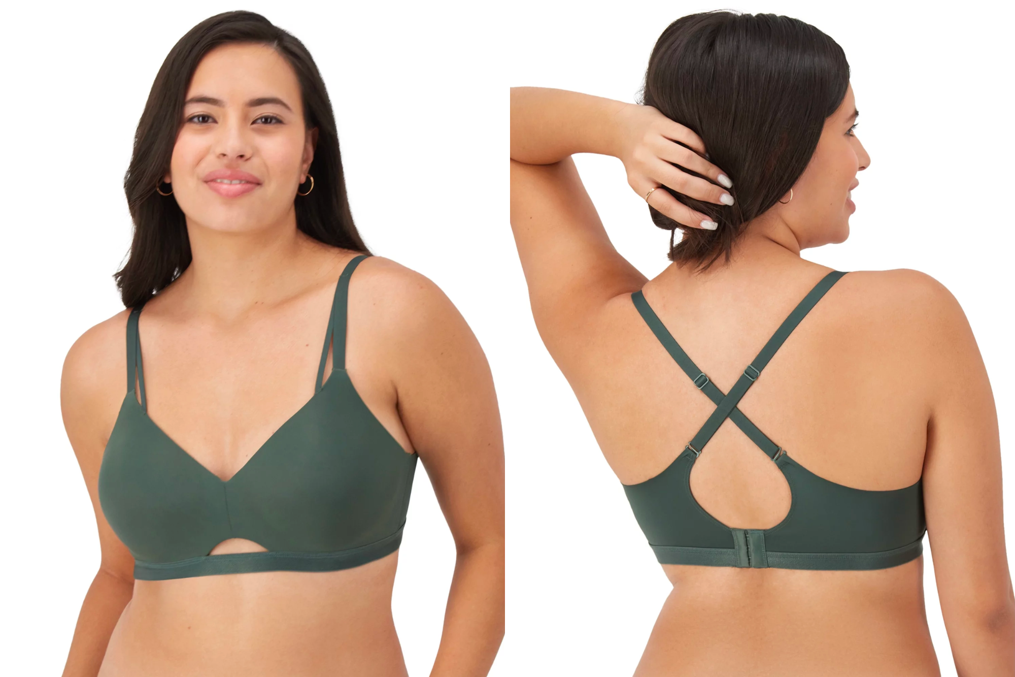 The Maidenform Modern Wireless Bra is a wireless bra with light lining that offers a gentle lift thanks to its foam cups. Its super-soft microfiber fabric is also extremely comfortable, while offering a smoothiing effect. Its double straps and modern neckline as well as the keyhole cut-out detail make it look more sexy than your average wireless bra, too.