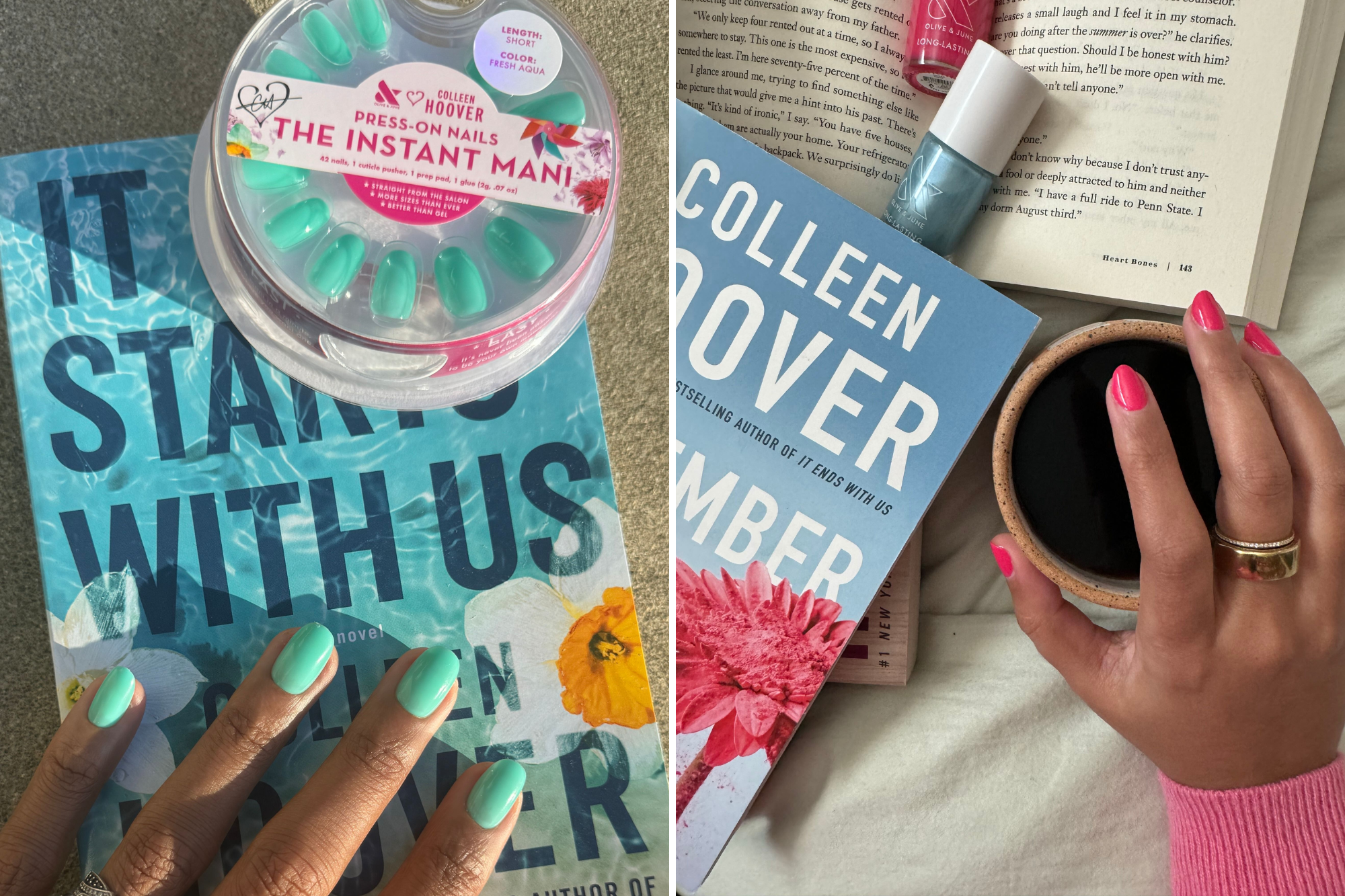 There’s nothing better than relaxing with a good book. And if you’re a Colleen Hoover fan, you’ve probably been doing a lot of that with the bestselling author’s various releases. You know what would go fabulously with a great story? A fresh new set of nails! Olive & June and Colleen Hoover have come together for the collab of the spring, with a range of nail products that’ll look great on you while you’ve got a new paperback in your hands.