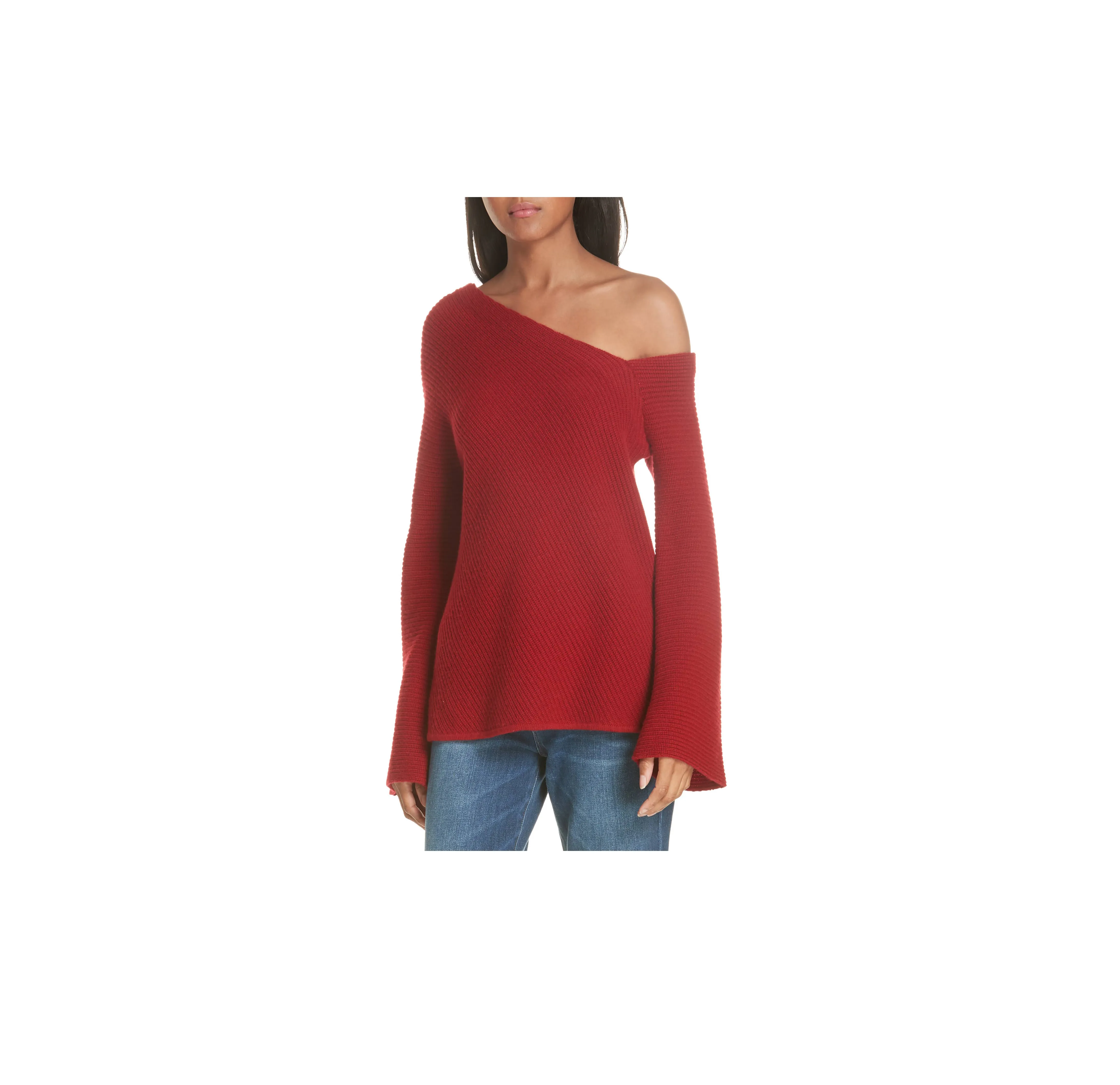 The A.L.C. Charly Wool & Cashmere Sweater has an asymmetrical neckline that drops down into a single shoulder reveal that we are absolutely crazy about.