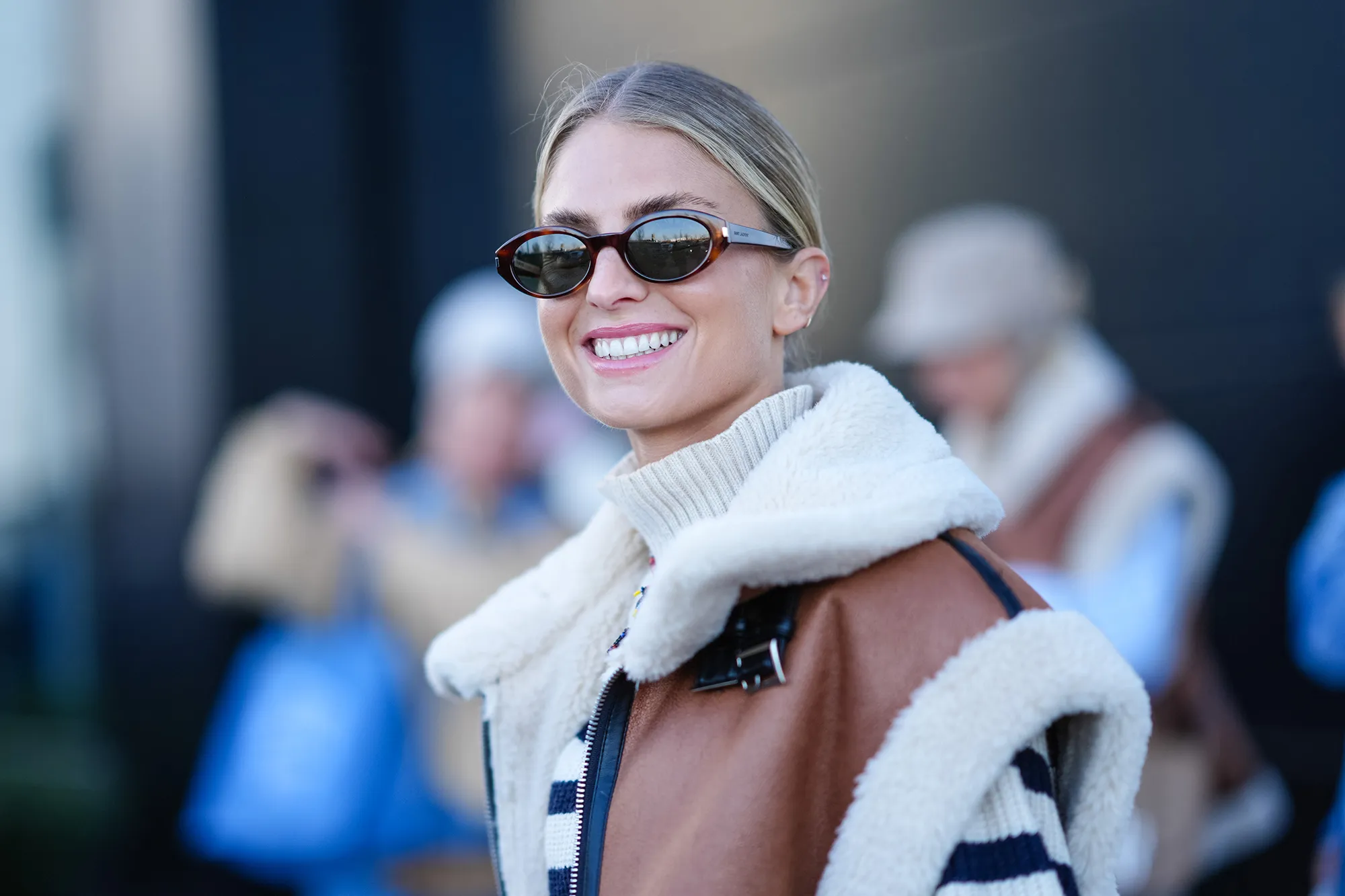 9. Cotton Classic: Exude quiet luxury for the day with this blue and white striped button-up top paired with trousers and gold jewelry — just $98!