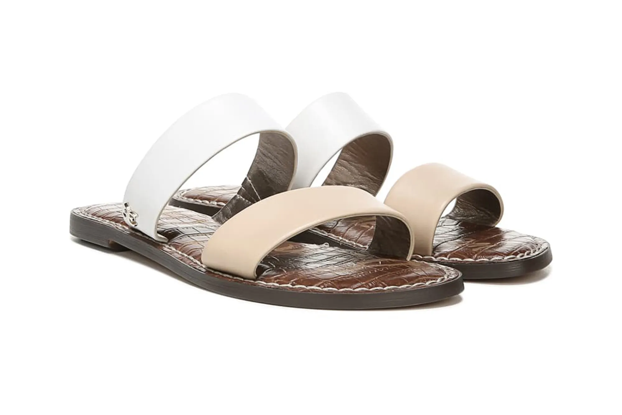 These open-toe slides have two straps across the vamp that will hold our foot in place and eliminate the incessant “click clack” sound of flip flops as we walk. These straps are either leather or textile, depending on which style we choose. There are smooth and shiny options, woven options and even snake print! One thing they all share in common, though, is a small Sam Edelman logo hardware detail on the strap closest to the heel!