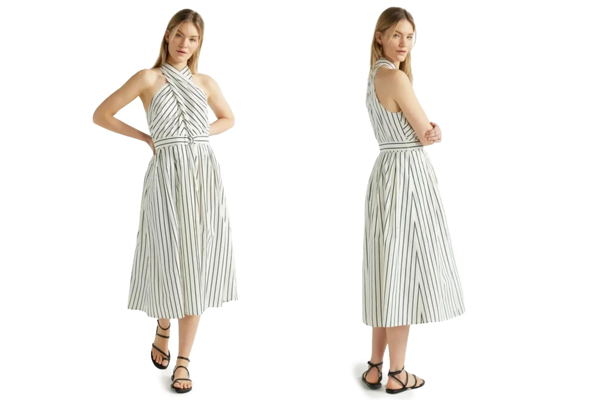 This Scoop halter midi dress is a cute, elevated alternative to add to your closet. If you’re looking for comfort and durability — look no further! This option uses a 97% cotton and 3% spandex material composition for a stretchy but breathable alternative. Also, it has a chic halter neckline that feels ‘70s-inspired — and even offers a neat belt to tie it all together!