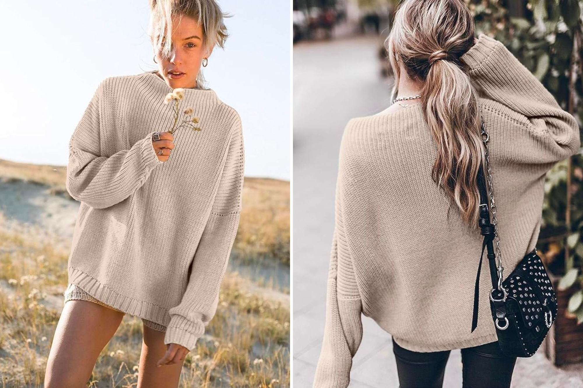 The Saukole Oversized Mock Neck Sweater is a knitted oversize sweater that comes in four different colors. It sits on your body like a tunic with its oversized construction, and it has loose shoulders, long sleeves, and a mock neck. It’s like wrapping up in a warm, knit blanket and turning in for a nice nap when you wear it.