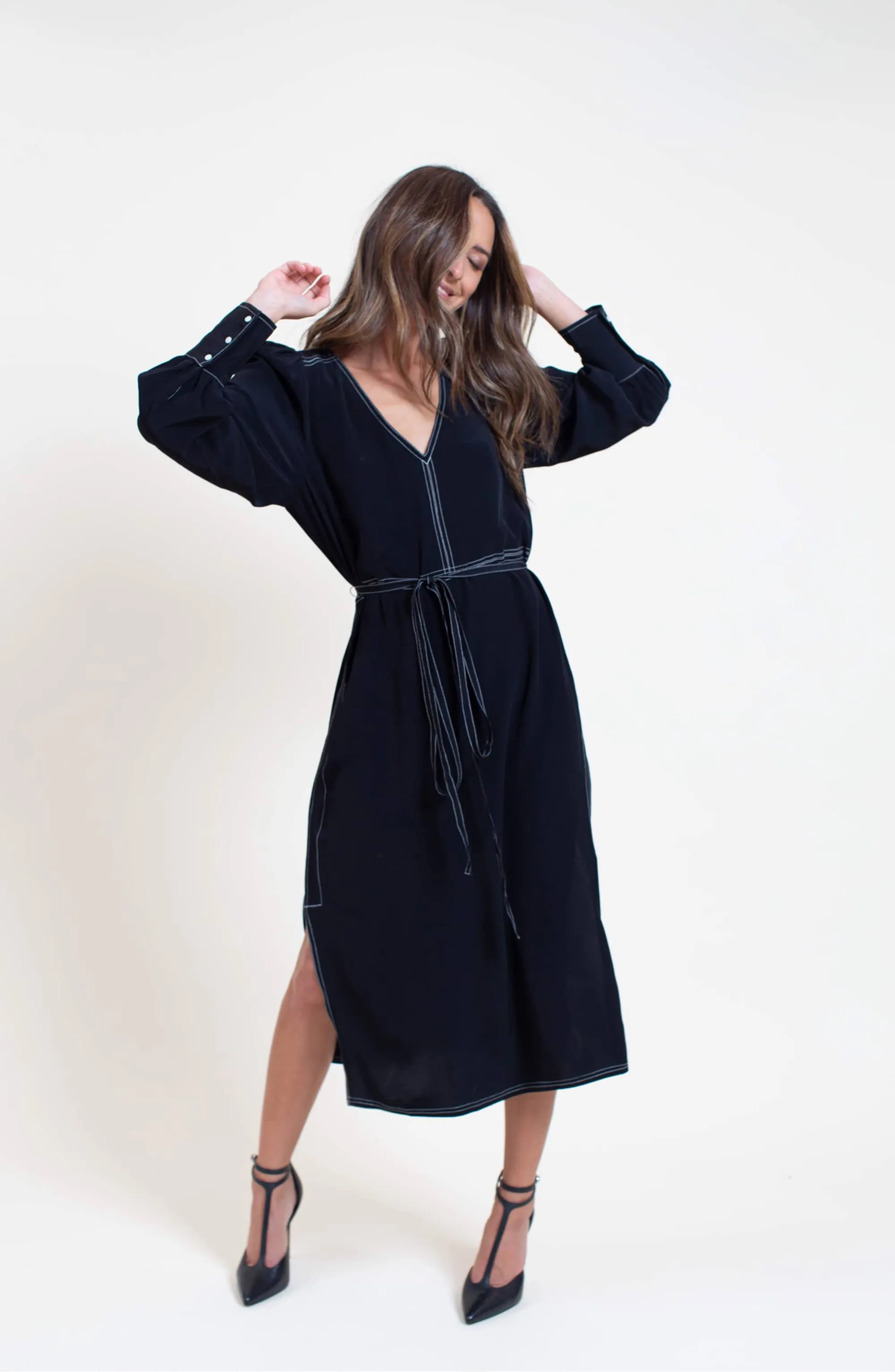 The stitching also makes an appearance on the wide, three-button cuffs at the ends of the sleeves. Because these cuffs are so wide, we can push them up ever-so-slightly to create a bishop sleeve effect! This beautifully complements the puffed shoulders, which lightly float atop our arms for a royal effect. Because this dress is understated in its exquisite allure, these shape-focused details really shine.