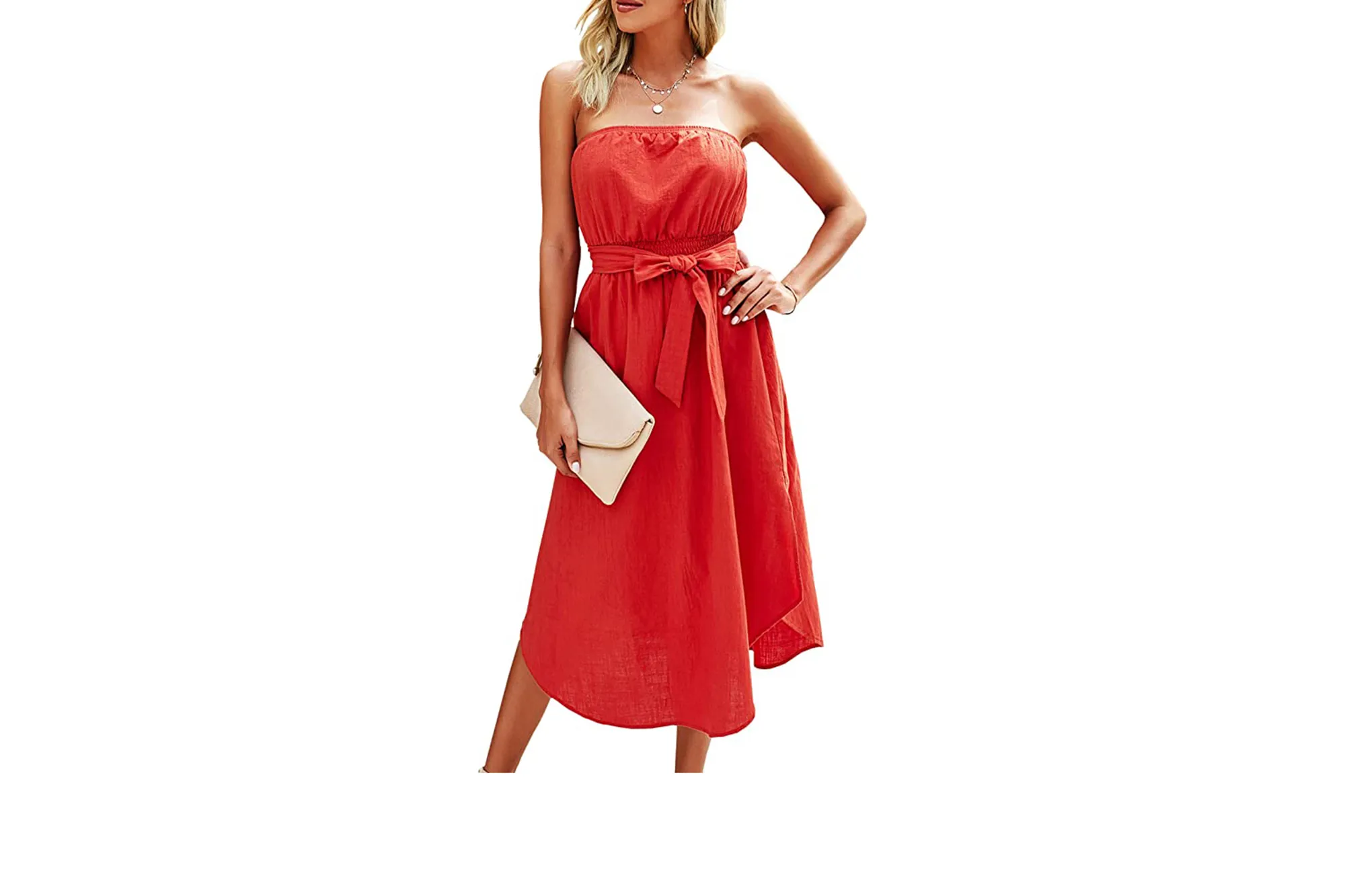 We finally found the perfect dress that will keep you cool in the summer without the danger of those dreaded pit stains! This strapless frock is somewhere in between a midi and a maxi. Effortlessly breezy, this sundress includes slits to allow extra air flow and a belt to accentuate your waist. Plus, it’s on sale for 30% off! Keep scrolling for all the scoop on your new summer uniform!