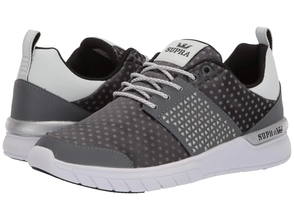 To add a classic print to our sneaker collections, we can snag the Supra Scissor Sneaker in this dark grey and white sneaker featuring polka dot and triangle prints. These shoes have a playful look to them without appearing to gaudy.