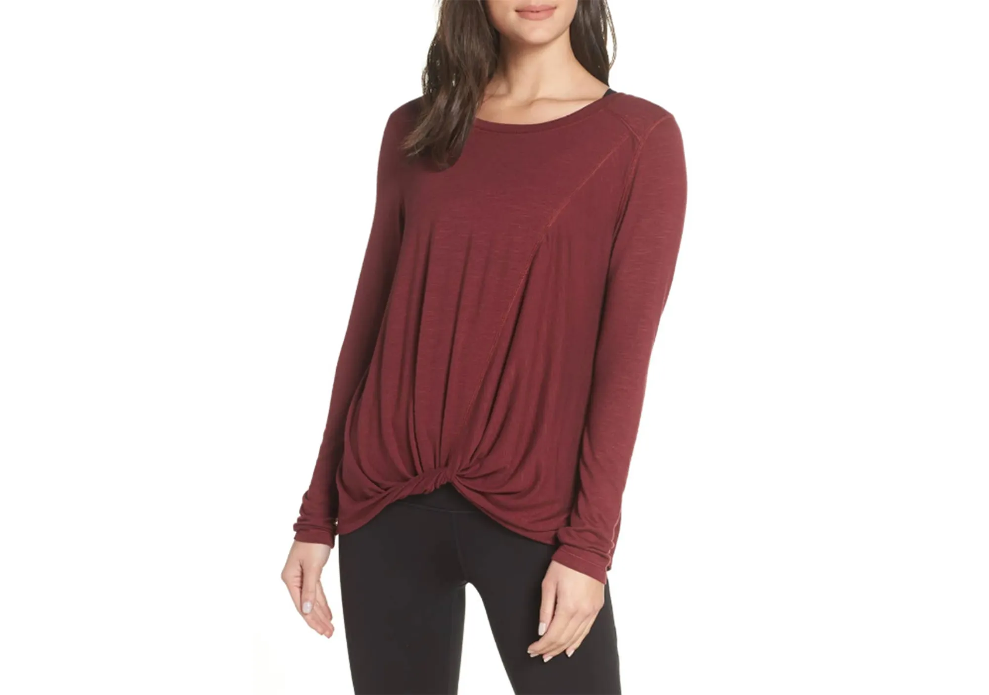 This airy knit tee is one of those rare pieces that can be worth with dressy looks, athletic ensembles or any casual outfit we can conjure up. The figure-flattering twist at the base can be worn in the front or back, which means we can switch it up whenever we please.