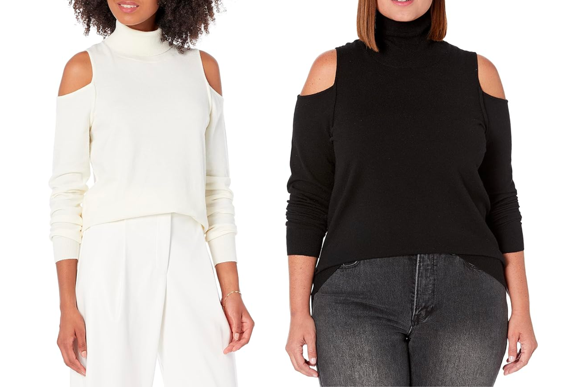 Amazon’s The Drop Gabriel Cold-Shoulder Sweater is a rayon and nylon blend that’s super soft and comfortably fuzzy. It’s made to fit snug on your body, but not in a clingy or too loose way. It also features a high collar akin to a turtleneck, with cuffed long sleeves.