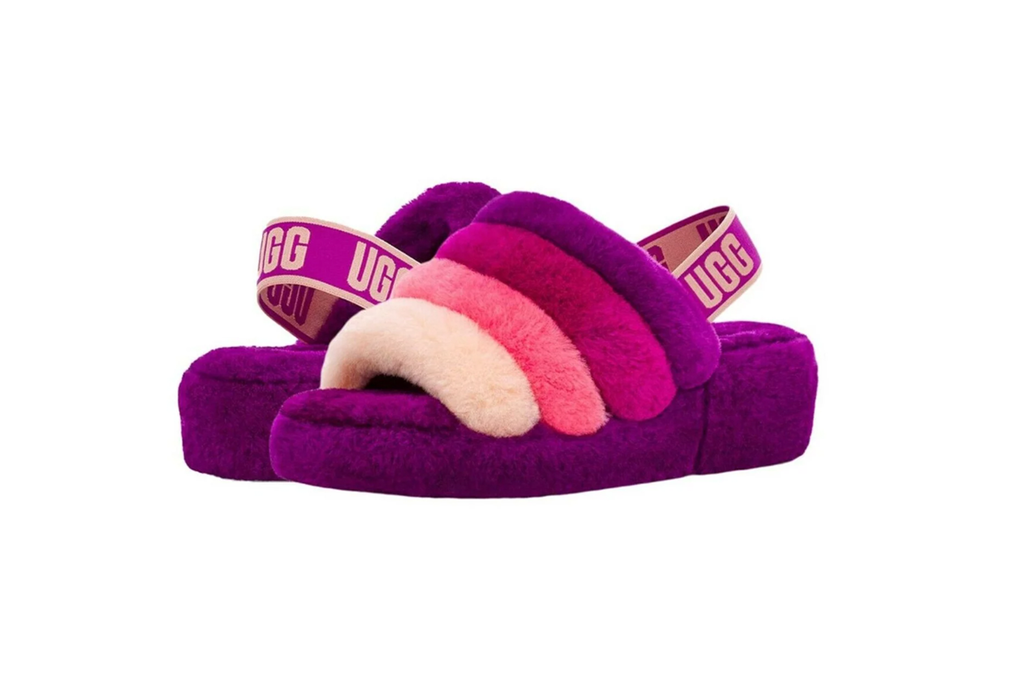 The Ugg Fluff Yeah Slide Sheepskin Slippers are a breezy yet warm option that’s versatile due to their plush uppers and open-toe, slip-on design. They come in a bright and punchy pink, purple and cream color scheme dubbed berrylicious that pairs well with many items already in your closet! These slippers also come with an elastic strap with the brand name etched all over, which adds a way to secure your shoes when wearing them. The slightly-platform rubber outsole provides traction to make sure no nasty falls happen.