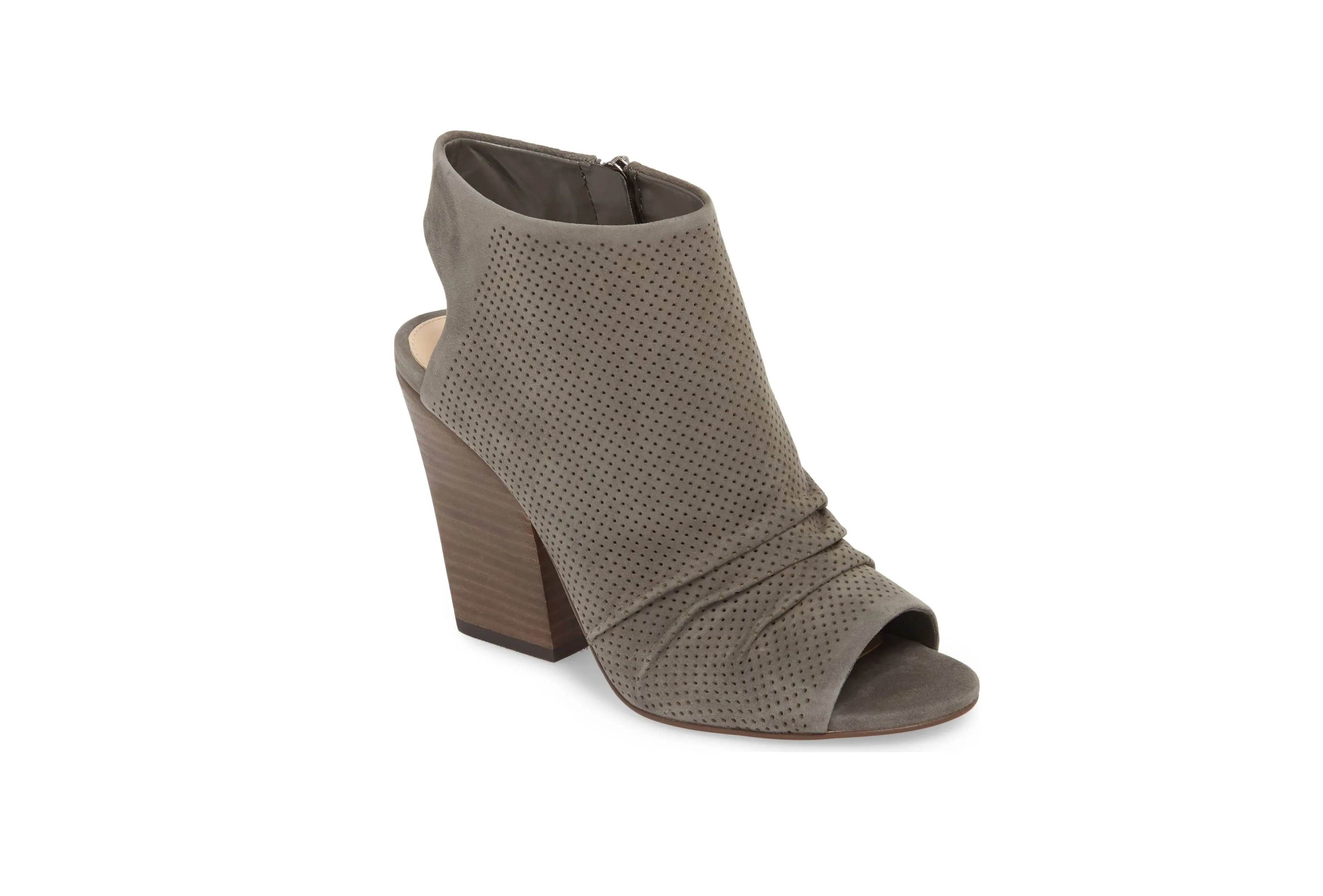 The Vince Camuto Kentvi Sandal is as stylish as it’s comfy. Designed with a 4.25” block heel, its sleek leather upper, side zip closure and silver hardware offer a polished, yet sophisticated look. Complete with a ruched cuff and perforated detailing, this smart-tailored design is sure to turn heads. Versatile in nature, we plan on adding this fabulous sandal to our everyday lineup before those snow days hit.
