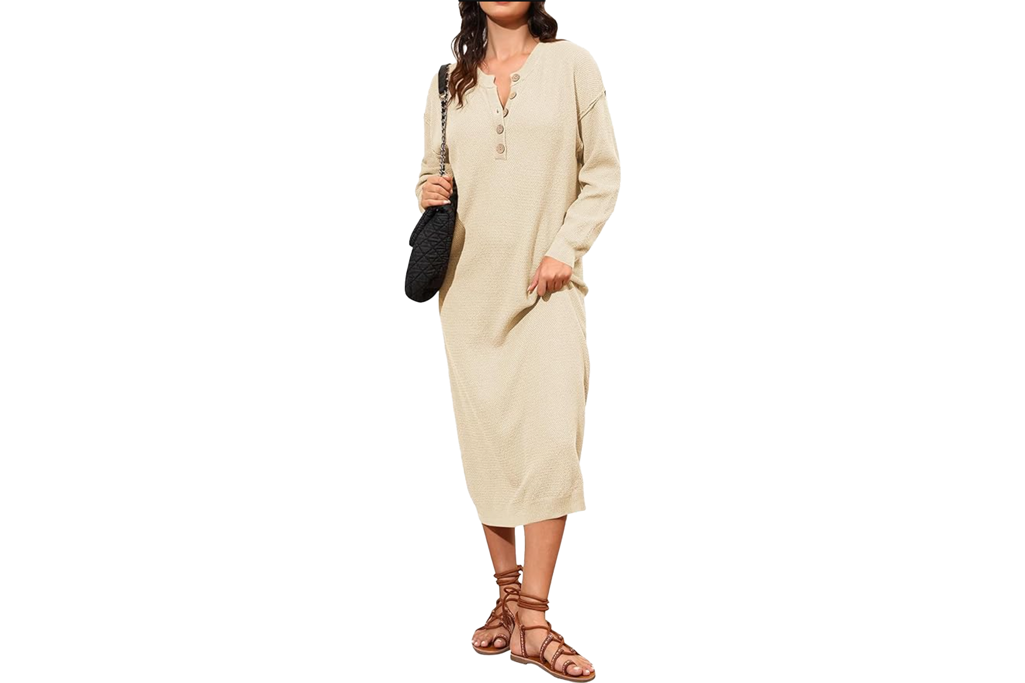 About this comfy sweater dress, one Amazon reviewer said, “This sweater dress is a perfect dress up or dress down type of outfit. It’s definitely a bit longer than I expected, but nothing that makes it look frumpy. I ordered the size large, and it’s a nice fit between comfortable and casual. The material is very breathable but warm, and I’m assuming it’s because of the waffle pattern it has. It doesn’t feel heavy but rather cozy, especially with the sleeves, giving it a small, baggy look. Overall, it’s a nice fall/winter dress that will fit the bill with boots or sneakers.”