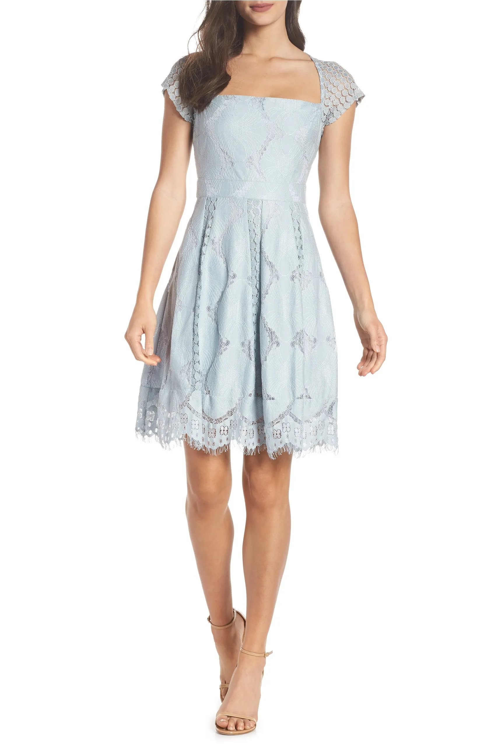 While it’s hard to pinpoint exactly what the duchess was wearing when the photo was taken, we can still use the color and shape of the dress as inspiration for our next shopping spree. She appears to be wearing a light blue slip dress with a square neckline and capped sleeves.